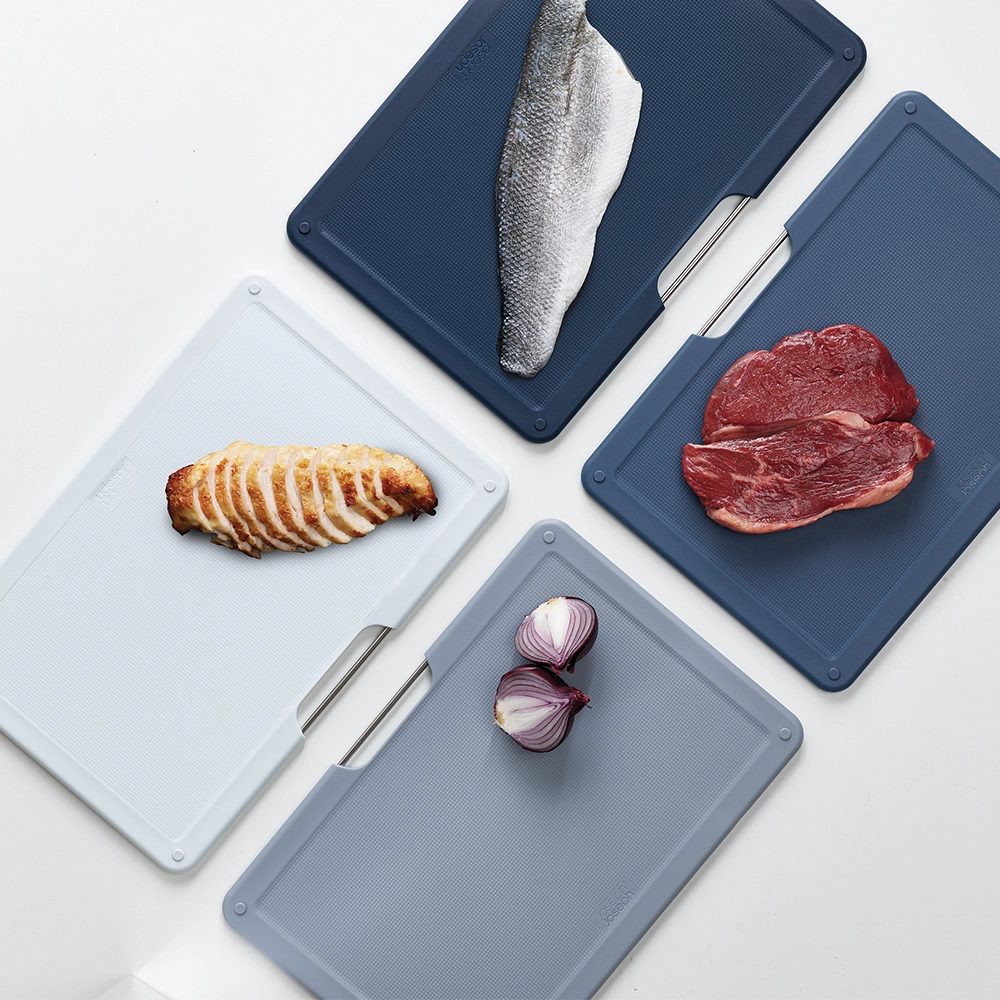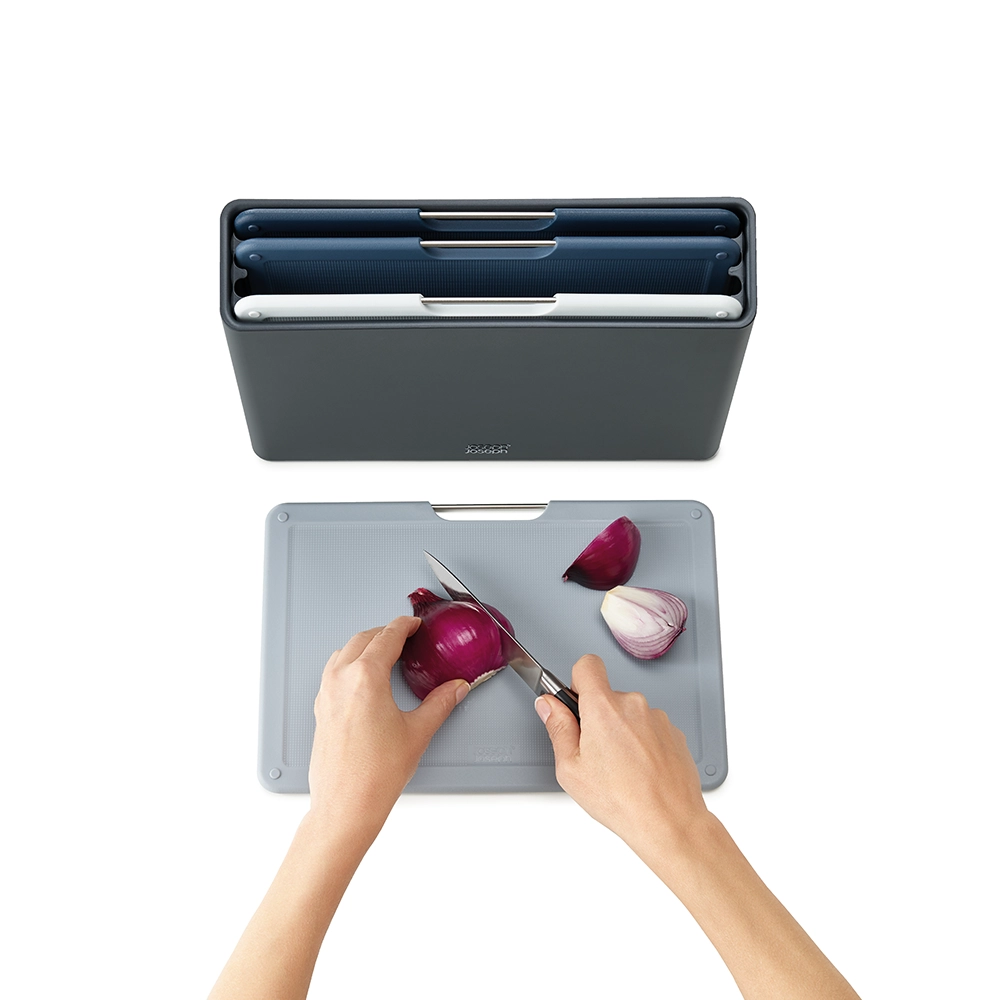 De snijplankenset van Joseph Joseph is een stijlvolle en praktische oplossing voor het bereiden en serveren van gerechten. Deze set bevat vier snijplanken, elk voorzien van antislipvoetjes voor een stabiele en comfortabele snijervaring.