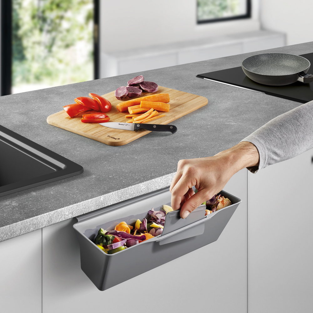 Handige aanrecht prullenbak om etensresten tijdens het koken in op te vangen. Geschikt voor elke keukenkast of keukenlade.