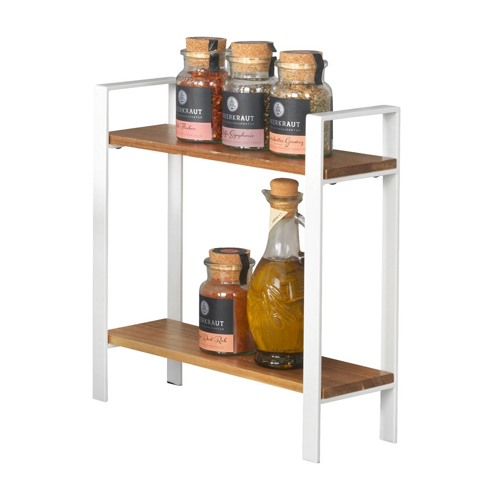 Stel je voor, geen rommel meer op je aanrecht, maar een stijlvolle en praktische opbergoplossing. Het aanrecht rek heeft een wit metalen frame dat niet alleen duurzaam is, maar ook een moderne uitstraling biedt. De bruine acaciahouten planken voegen een warme, natuurlijke touch toe die perfect past in elke keukeninrichting. Het product is beschikbaar in twee varianten, een hoekvariant en een recht; deze hebben de volgende afmetingen: