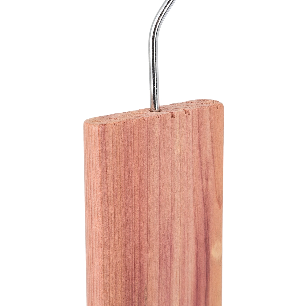 Deze handige cederhouten plankjes zijn voorzien van een metalen haak, waardoor je ze eenvoudig in je kledingkast of andere opbergplaatsen kunt ophangen. Deze anti motten cederhout hangers zijn gemaakt van onbehandeld cederhout, dat bekend staat om zijn aangename en natuurlijke geur. Deze geur is aantrekkelijk voor mensen, maar houdt motten, pelskevers, zilvervisjes en andere schadelijke insecten op afstand. Dankzij de praktische haak kun je de plankjes gemakkelijk aan een kleerhanger of direct aan de kledingroede hangen. Om te voorkomen dat de natuurlijke oliën van het cederhout vlekken veroorzaken op je kleding, wordt aangeraden om een kleine afstand te houden tussen de plankjes en je kledingstukken.