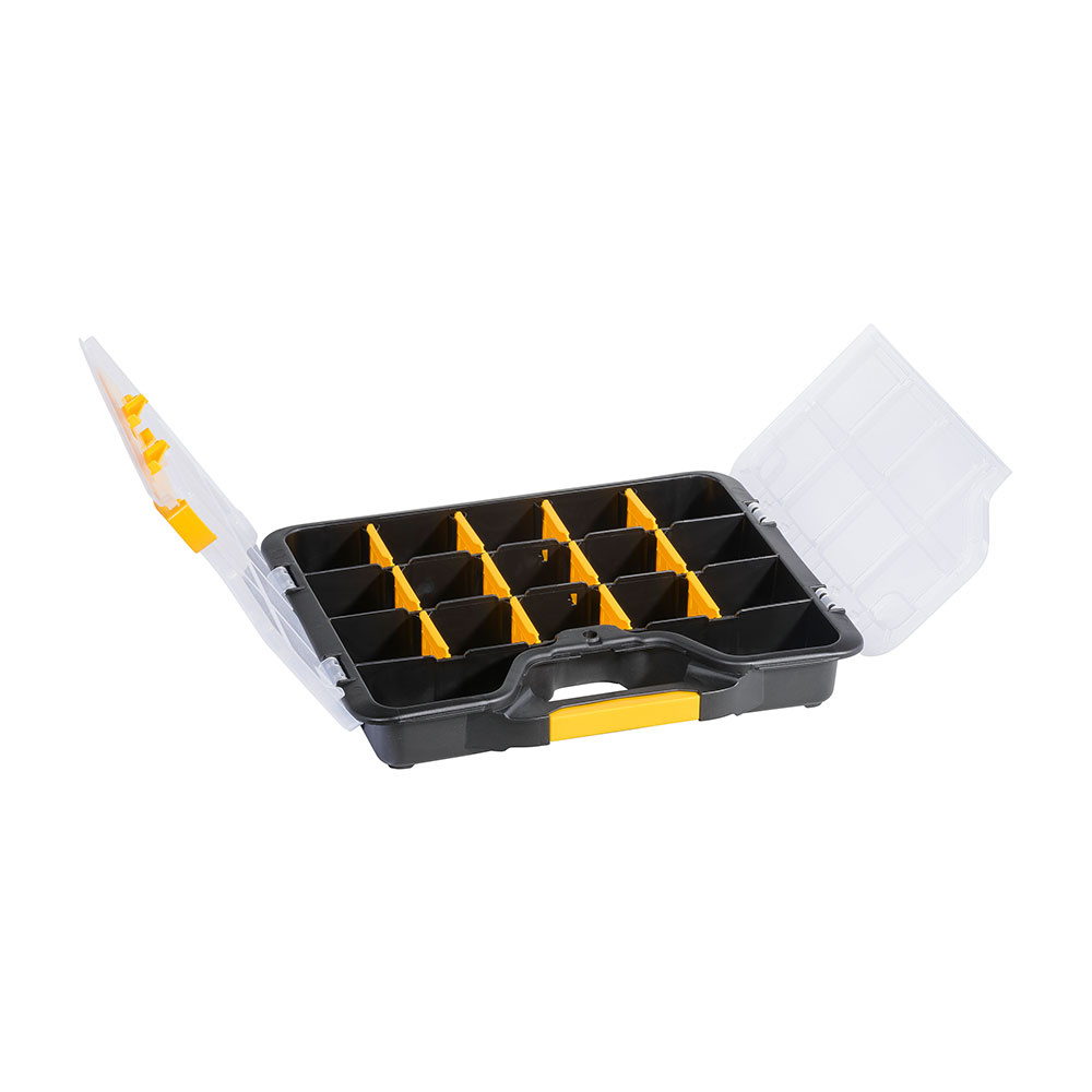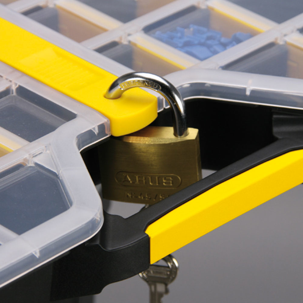 De assortimentsbak van Allit is gemaakt van stevig zwart kunststof en heeft een transparant dekselslot dat af te sluiten is met een sterke schuifclip sluiting. Daarnaast ook nog te beveiligen met een hangslot (niet meegeleverd.) Het handvat is ergonomisch. Niet alleen kun je met de verstelbare verdelers zelf sorteervakken creëren, ook kun je met verbindingsclips maximaal drie assortimentsdozen aan elkaar koppelen. Spijkers en schroeven opbergen was nog nooit zo eenvoudig