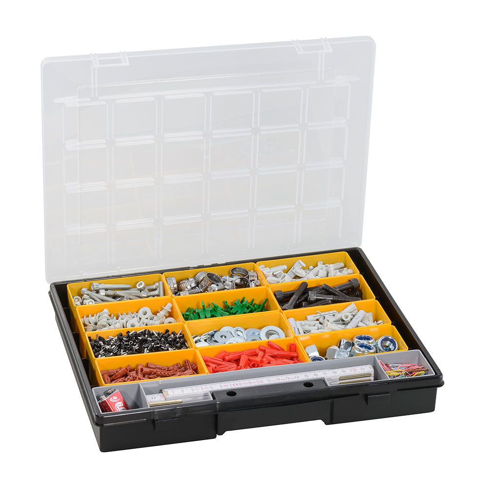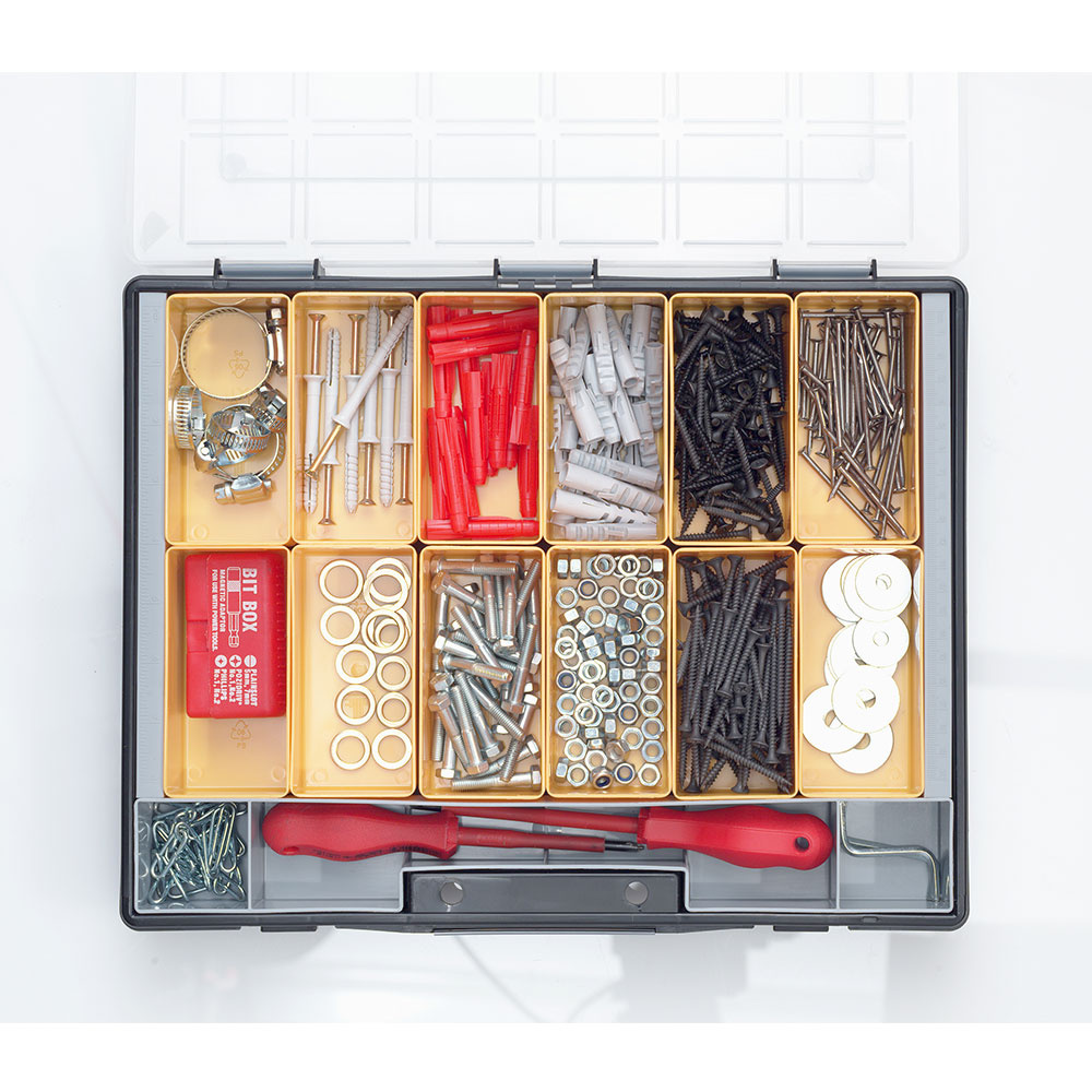 De Allit assortimentsdozen, gemaakt van stevig kunststof, zijn van de buitenkant zwart en hebben ieder een transparant deksel met stevige kliksluiting. De grijze inzet met drie vaste vakken, te gebruiken voor bijvoorbeeld een schroevendraaier, zit in iedere sorteerbak. Elke organizer heeft andere kleuren en afmetingen qua sorteerbakjes. Wil je de assortimentsdozen graag zelf inrichten? Kies dan voor de Allit assortimentskoffer.