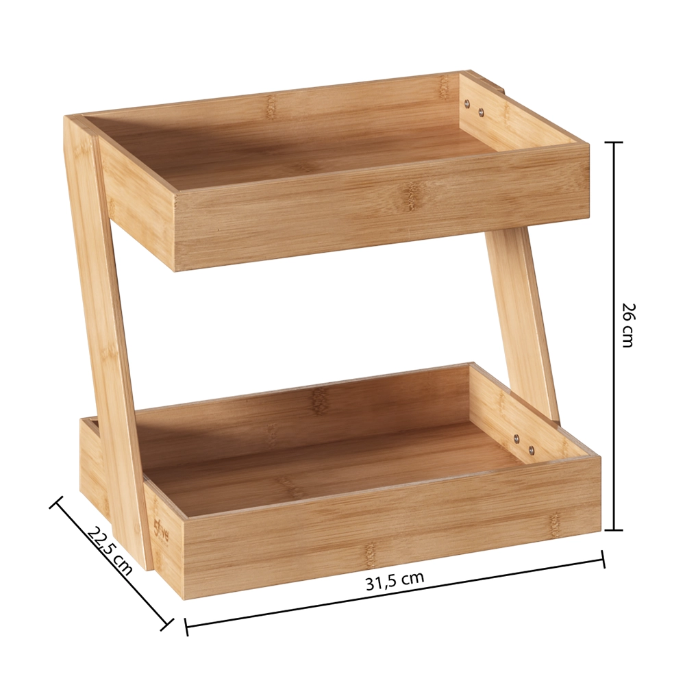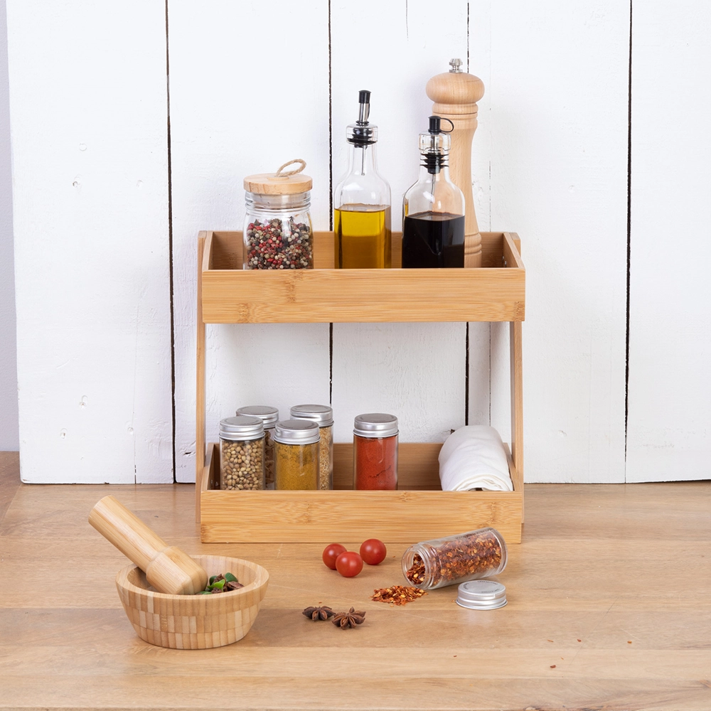 Met twee etages boven elkaar en een stevig ontwerp is dit rek ideaal voor het opbergen van kruidenpotjes, oliën, en andere keukenbenodigdheden. Dit aanrecht rek heeft een compact formaat van 31,5 cm breed, 22,5 cm diep, en 26 cm hoog, waardoor het niet te veel ruimte inneemt op je aanrecht, maar toch voldoende opbergruimte biedt. De twee etages, elk met een opstaande rand, zorgen ervoor dat je spullen veilig en stabiel blijven staan. Het bamboe keukenrek weegt slechts 900 gram, waardoor het licht en gemakkelijk te verplaatsen is, maar toch stevig genoeg om al je kruiden en flessen te ondersteunen. Het duurzame bamboemateriaal geeft dit aanrecht rek niet alleen een natuurlijke en warme uitstraling, maar maakt het ook een milieuvriendelijke keuze voor je keuken. Het bamboe kruidenrek is perfect voor het organiseren van je kruiden, oliën, en andere kleine keukenitems, zodat je aanrecht altijd netjes en overzichtelijk blijft.