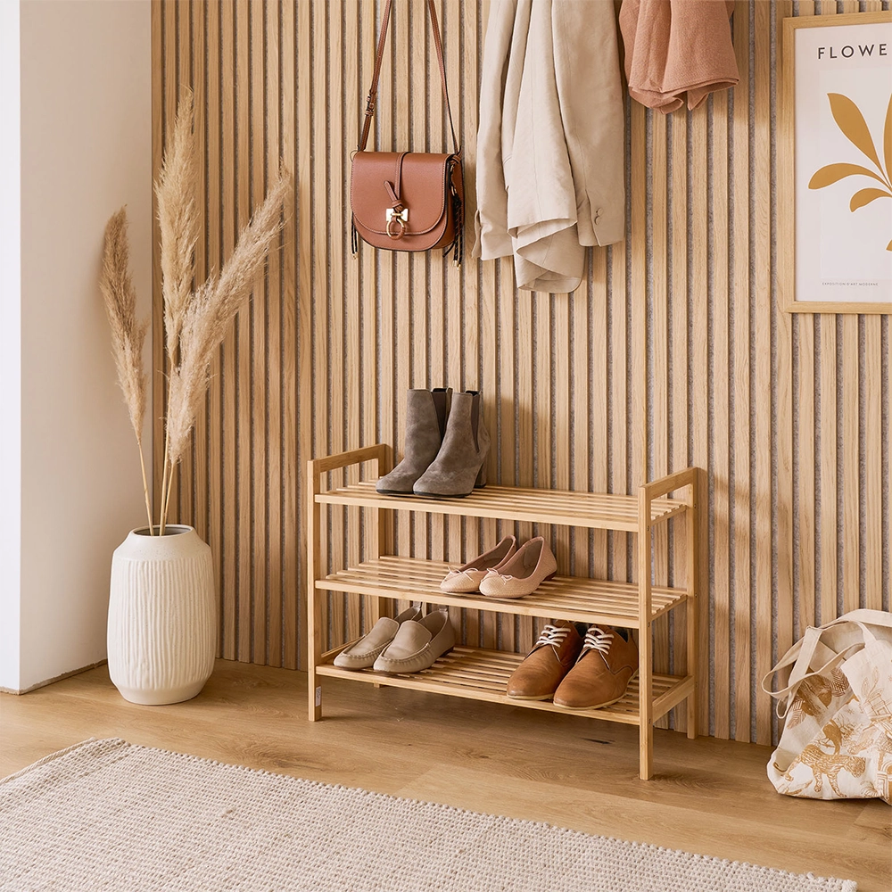 Het eenvoudige ontwerp van dit schoenenrek is gemaakt van natuurlijk bamboe, waardoor het perfect past bij elke woonstijl. Het rek heeft drie stevige planken die elk ongeveer 15 kg kunnen dragen, dus je kunt erop vertrouwen dat al je schoenen veilig en georganiseerd worden opgeslagen. Het bamboe schoenenrek is 70 cm breed, 26 cm diep en 50 cm hoog in totaal.