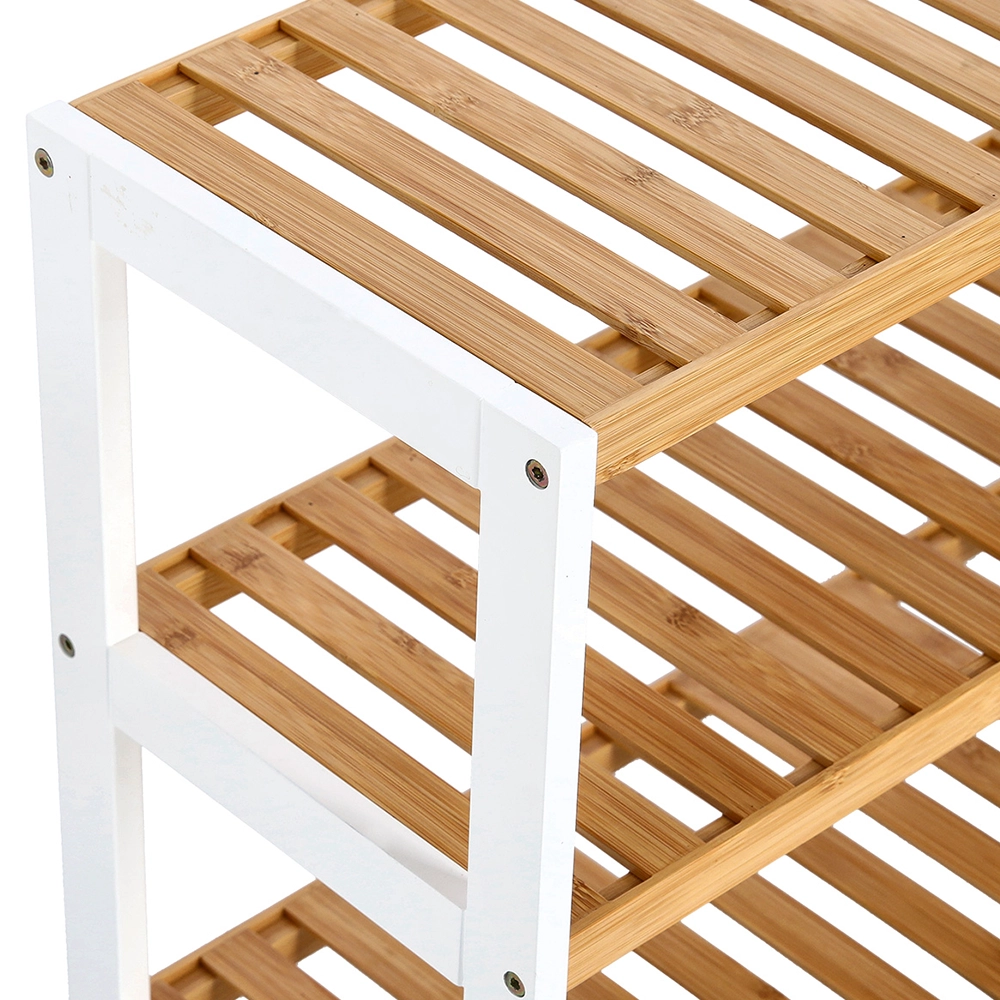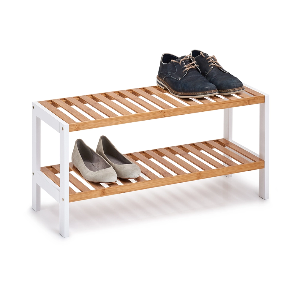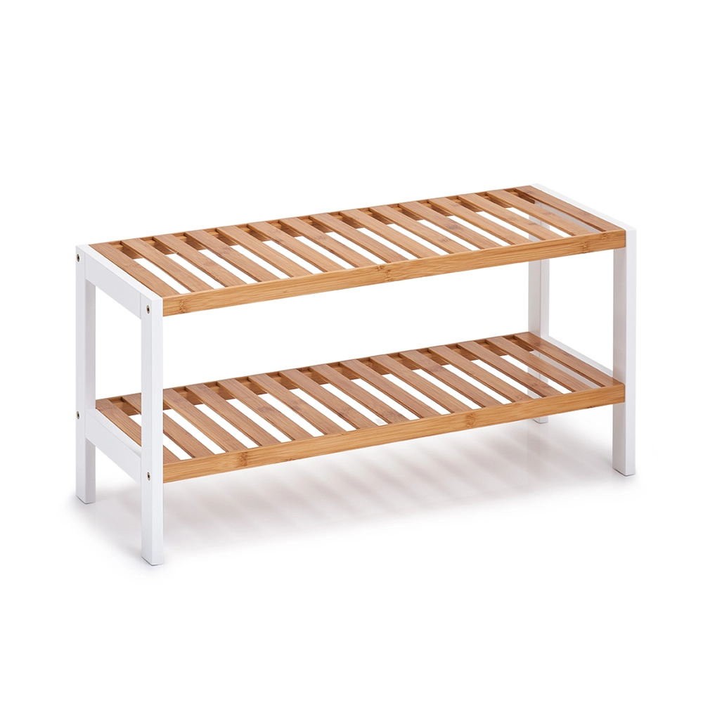 Het bamboe schoenenrek heeft twee MDF witte zijkanten waardoor het rek niet alleen een natuurlijke uitstraling heeft maar door de witte accenten ook een vleugje luxe toevoegt. Deze combinatie zorgt ervoor dat het rek perfect past in meerdere intereurstijlen. Het schoenenrek is er in 2 formaten: