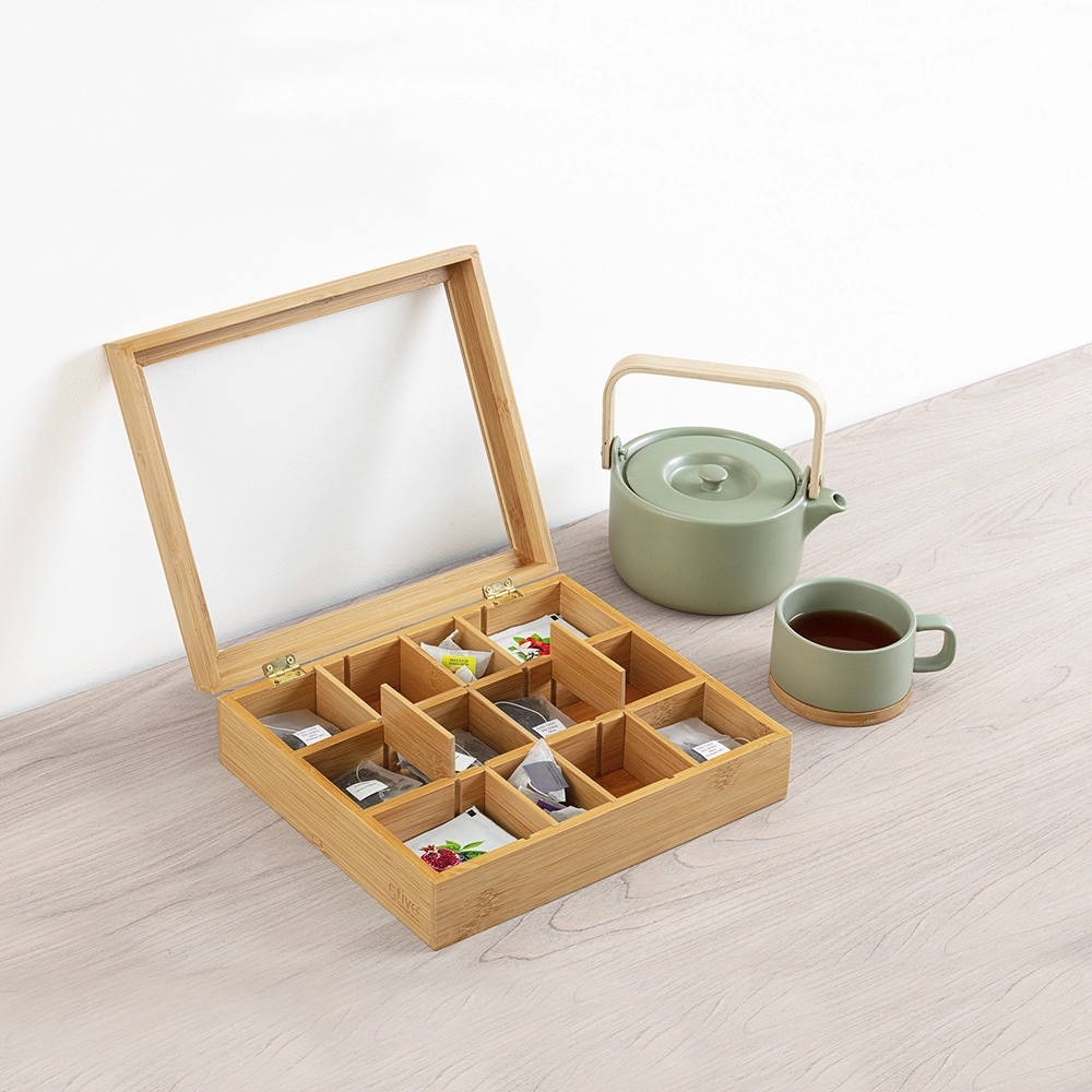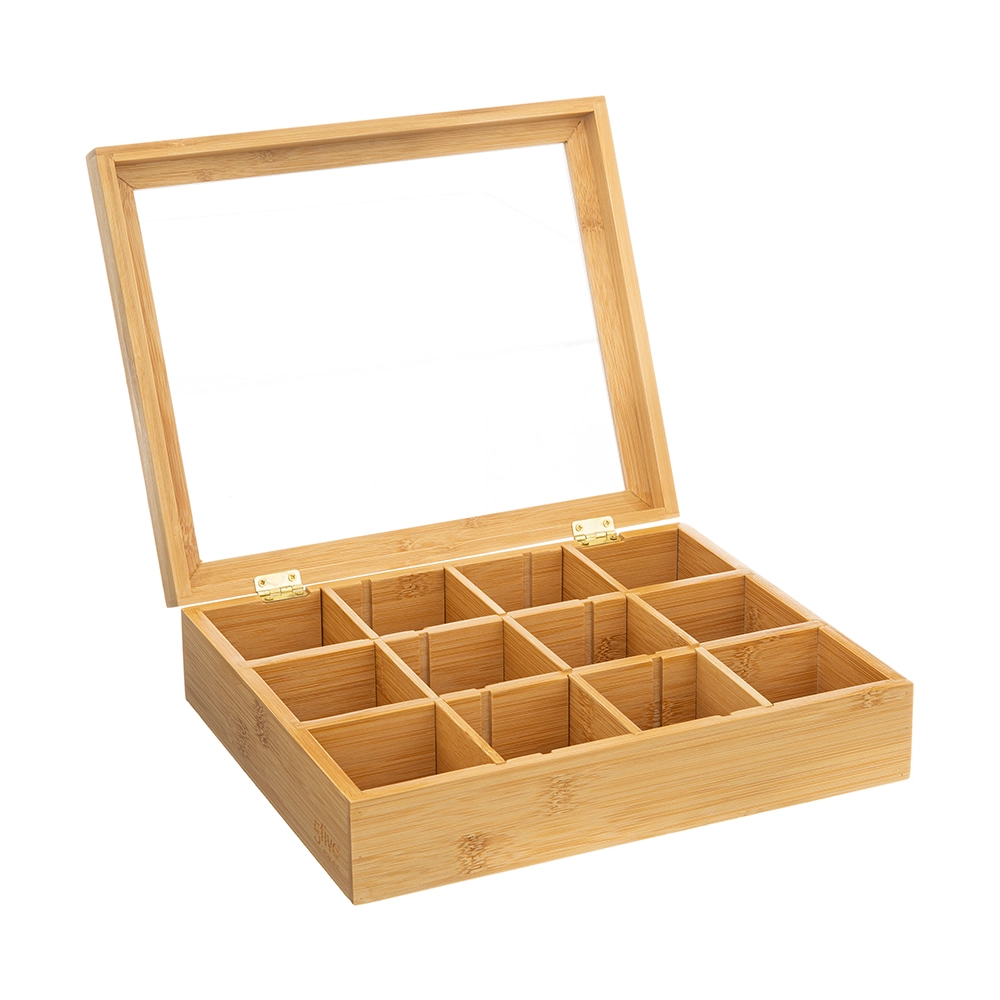 Mooie bamboe theedoos met 6 of 12 aparte vakken om al je favoriete smaken thee in op te bergen. Met deksel van transparant acryl, zodat je direct kunt zien wanneer het tijd is om de theezakjes weer bij te vullen.