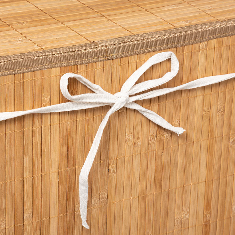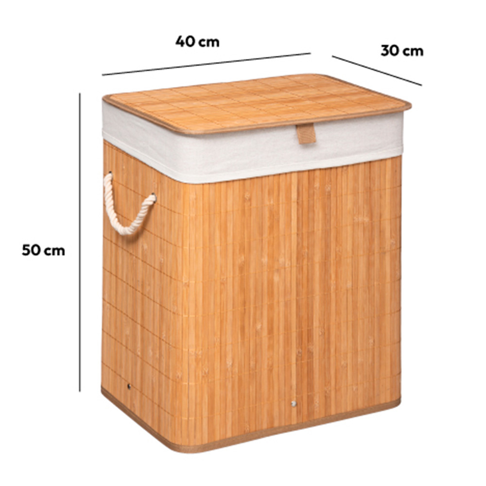 De wasmand is gemaakt van bamboe en heeft een katoenen binnenzak. Beschikbaar in houten of zwarte kleur. Aan beide zijkanten zitten handvaten en de inhoud is 60 liter. De mand heeft een afsluitbare deksel en is 41 cm breed, 30 cm diep en 50 cm hoog.