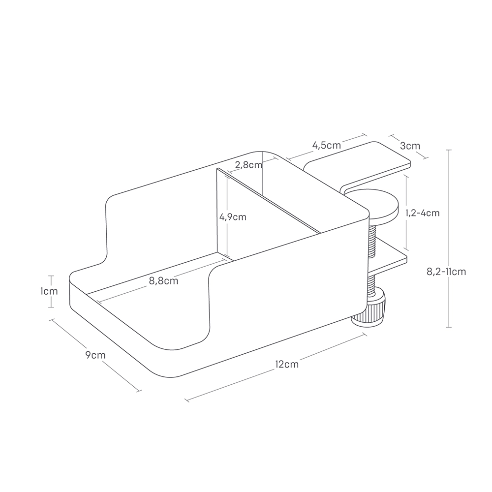 Deze bureau organizer is gemaakt van hoogwaardig metaal en is ontworpen om licht en duurzaam te zijn. Met een compartiment voor een drinkbeker en een apart vak voor een telefoon of afstandsbediening, biedt deze houder praktische opslag zonder je werkruimte te belasten. Aan de onderkant bevindt zich een opening voor kabelbeheer, zodat je eenvoudig je telefoon kunt opladen terwijl de kabels netjes uit het zicht blijven. Met afmetingen van 9 cm breed, 16,5 cm diep en 11 cm hoog is deze organizer compact maar uiterst functioneel.