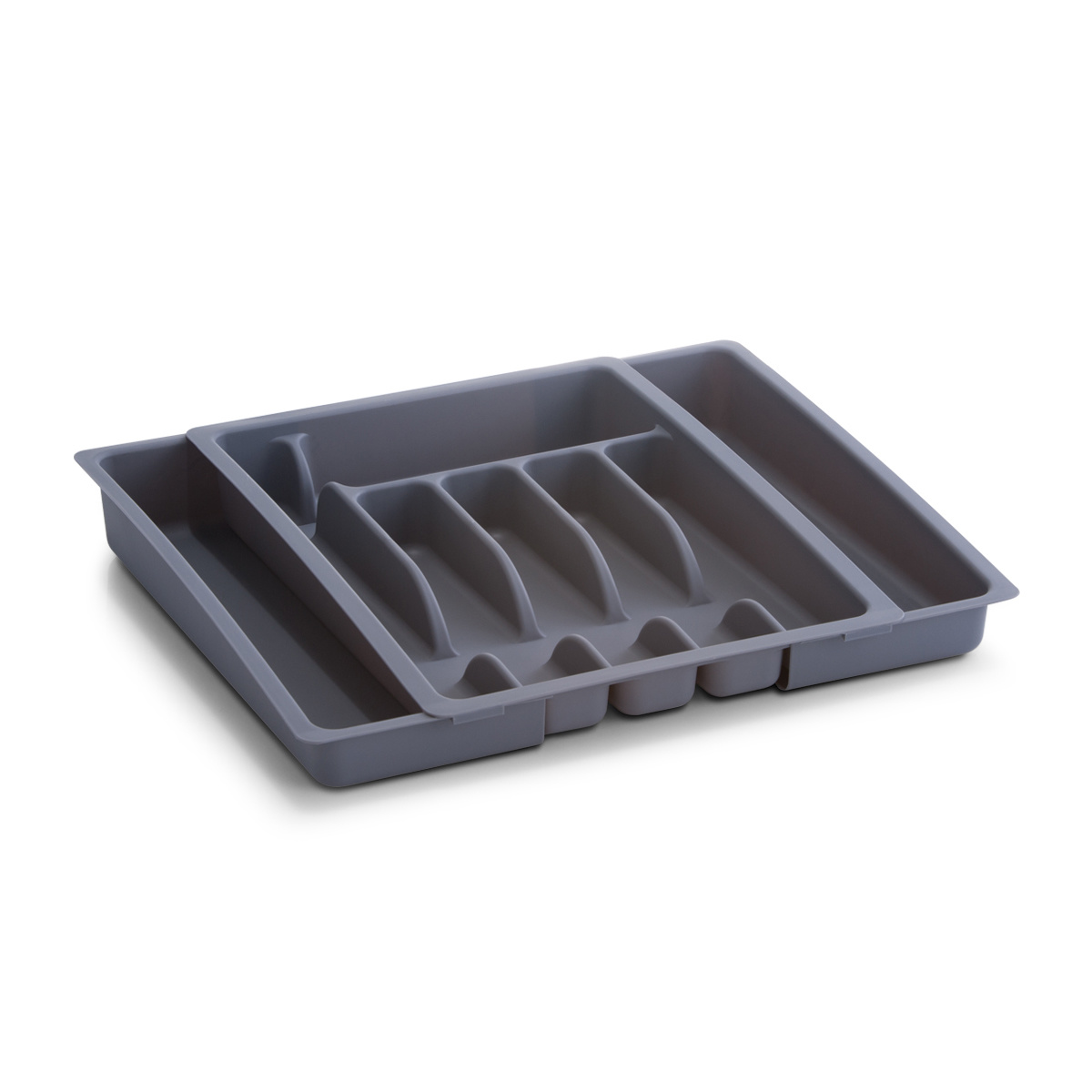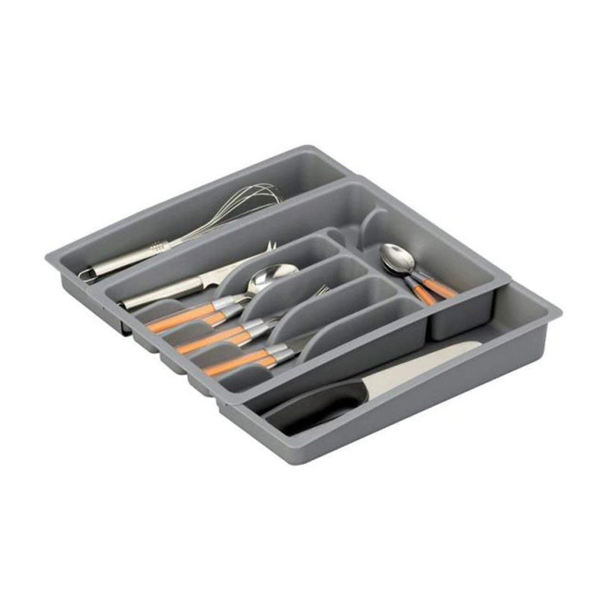 De grijze bestekbak voor een lade is gemaakt van een stevige kunststof. Het heeft een afmeting van 28 cm breed, 38 cm diep en 6,5 cm hoog. Doordat het een uitschuifbare bestekbak is kan de breedte verlengd worden tot wel 48 cm.