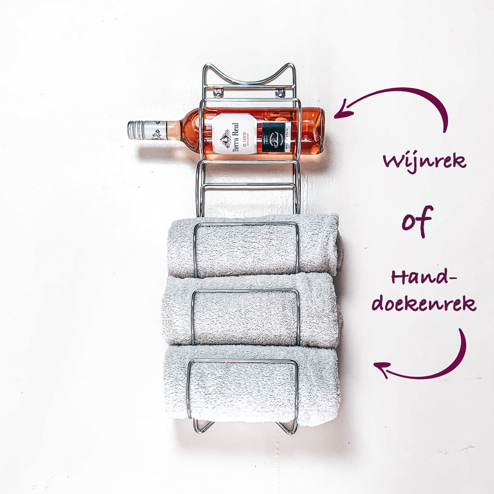 Wijnen, wijnen, wijnen! Daar zeg ik zeker niet snel nee tegen. Dit flessenrek voor aan de muur is bedoeld voor wijnflessen, maar toen ik op een punt aankwam dat het rek leeg was geraakt, bedacht ik me dat het handig zou zijn om het rek nog een tweede functie te geven. Als je het rek als handdoekenrek gebruikt, kun je handdoekjes op een leuke manier in het zicht opbergen. Het rek kan dus ook zeker in de badkamer worden opgehangen! Om handdoekjes en wijn in hetzelfde rek op te bergen, vond ik achteraf eigenlijk ook geen gek idee. Een flesje wijn om in bad op te drinken, anyone? ;)