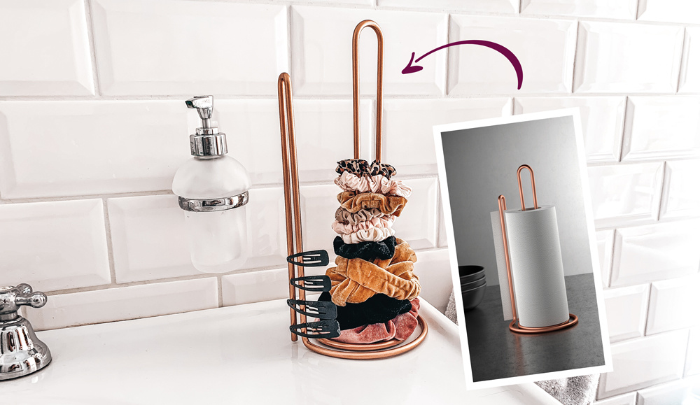 Om scrunchies en elastiekjes los in een bak te bewaren, ziet er al snel rommelig uit. En aangezien mijn scrunchie-collectie snel aan het groeien is, was ik op zoek naar een andere oplossing om deze haaraccessoires op te bergen. Ik vind het juist erg leuk om ze in het zicht te houden omdat ze wat kleur aan een ruimte geven, en een keukenrolhouder is daar perfect voor! Ik ben gegaan voor deze toffe keukenrolhouder in koperkleur om neer te zetten. Het deel wat je normaal gebruikt om je keukenrol makkelijk af te scheuren, heb ik gebruikt om wat speldjes aan vast te maken, maar kan je ook gebruiken voor kleinere elastiekjes of andere accessoires. Als je een plank of kastje hebt, kun je ook kiezen voor een hangende keukenrolhouder!