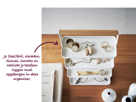 Wanneer we ontwaken zullen velen van ons de telefoon of tablet pakken. Sommigen hebben wat water op hun nachtkastje staan en anderen bewaren weer hun bril of lenzen op het nachtkastje. Hoe dan ook, je nachtkastje bevat de producten die je graag gebruikt voor het slapen gaan of wanneer je wakker wordt. Een nachtkastje organizer is hier een fijne oplossing voor, een rommelig nachtkastje is namelijk een no-go. Een fijne organizer hiervoor is de accessoires organizer van Yamazaki. Met meerdere etages onderscheid je al je prullaria makkelijk van elkaar.