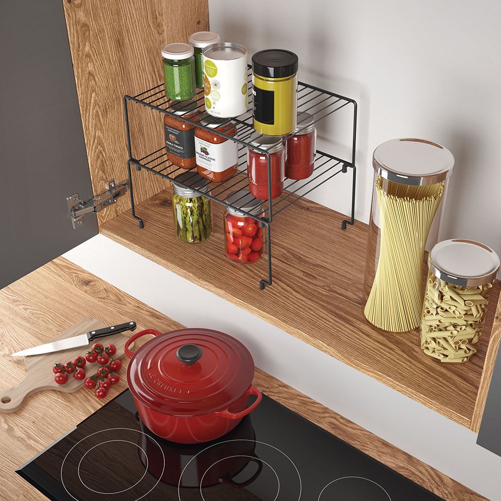 Dit roestbestendig rekje is ideaal om te gebruiken in elke keuken, aangezien het rekje stapelbaar is en voorzien is van anti-slip pootjes tegen verschuiven. Het rek is te gebruiken voor het opbergen van kruiden, medicijnen, koffie en thee toebehoren of kleine voorraadpotjes. Ook kun je met dit rekje van Metaltex gemakkelijk je keukenkast organiseren in u-vorm (zie afbeelding). Zorg voor extra ruimte op het aanrecht of in je kast met dit keukenrekje met twee extra plankjes.