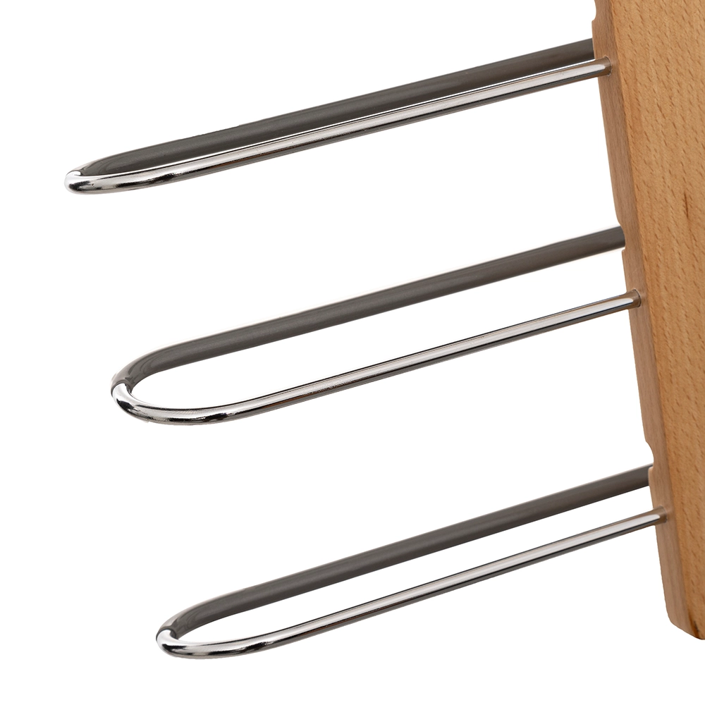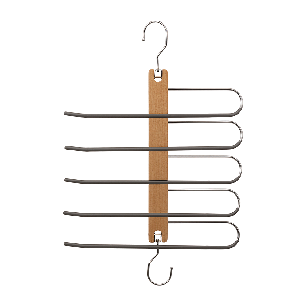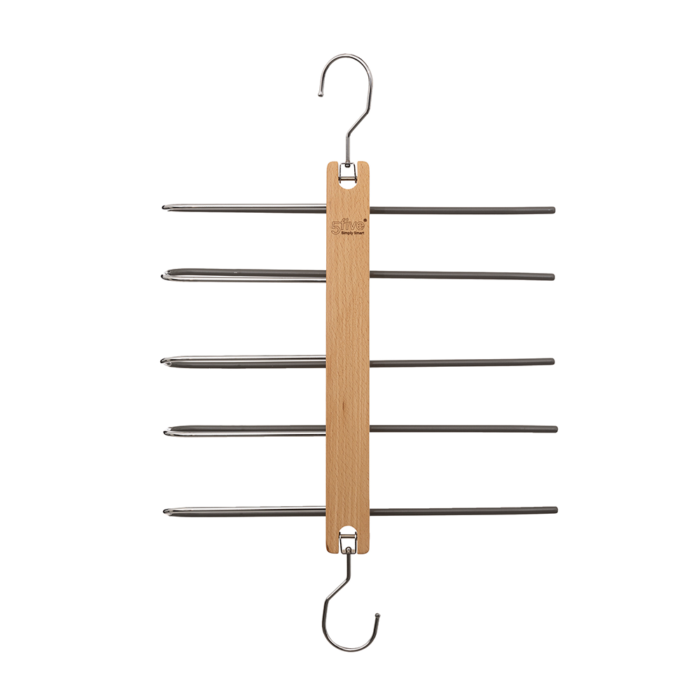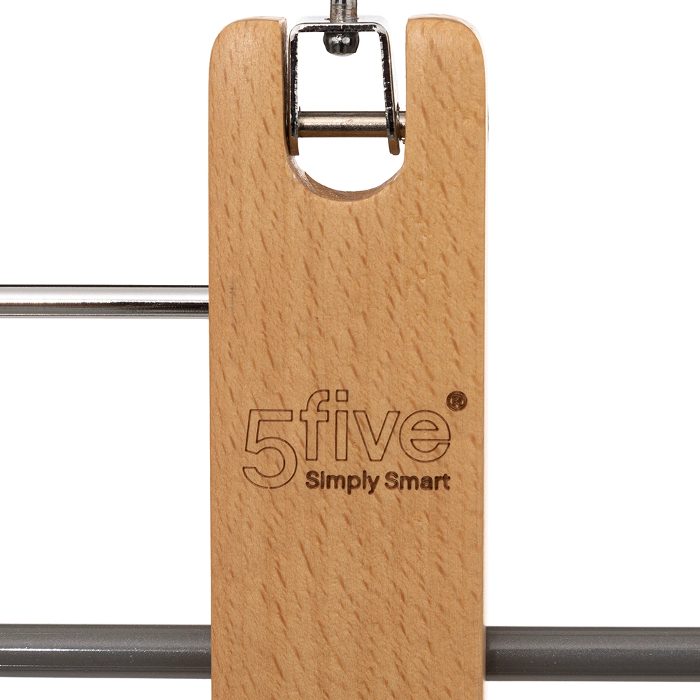 De broek hanger van Five® is de perfecte oplossing voor wie efficiënt zijn broeken wil opbergen zonder concessies te doen aan stijl en kwaliteit. Deze houten hanger biedt ruimte voor maar liefst vijf broeken (of andere kledingstukken) en kan zowel horizontaal als verticaal worden opgehangen, afhankelijk van de beschikbare ruimte in je kledingkast.
