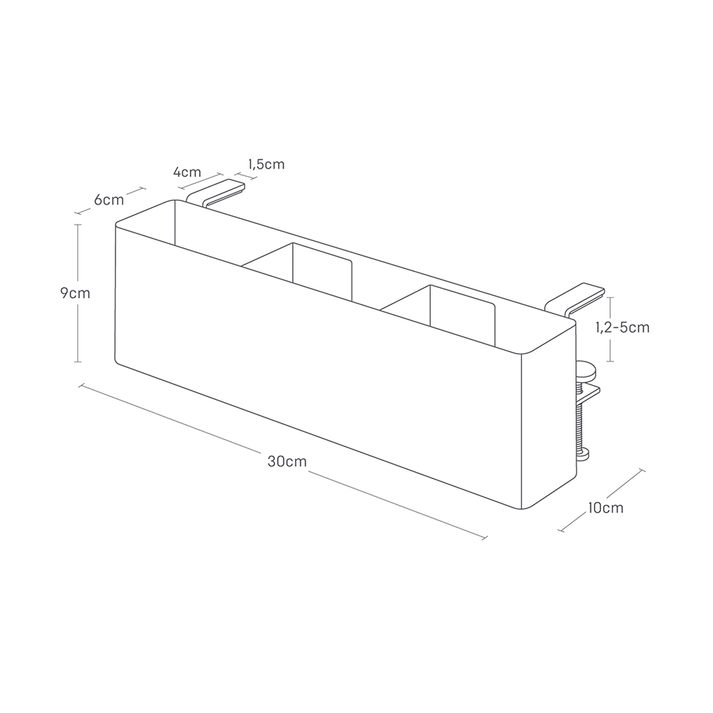 Het stijlvolle, zwarte ontwerp past perfect in elke werkruimte en zorgt voor een opgeruimd en georganiseerd bureau. Dit bureau bakje is niet alleen praktisch, maar ook veelzijdig. Het is gemaakt van hoogwaardig staal en de ondiepere variant heeft tevens 2 uitneembare magnetische verdelers, zodat je de indeling naar wens kunt aanpassen. Bovendien hebben beide varianten een opening aan de onderkant voor kabelbeheer, zodat je gemakkelijk apparaten kunt opladen terwijl de kabels netjes worden opgeborgen. Verkrijgbaar in twee formaten: een ruime variant van 30 cm breed, 18 cm diep en 11 cm hoog, en een compactere variant van 10 cm diep. Kan bevestigd worden aan een tafelbladdikte van 1,2 tot 5 cm dik.