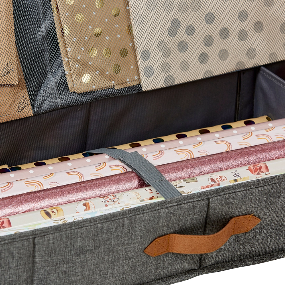 Deze cadeaupapier tas is bekleed met een duurzame katoen-linnen stof die niet alleen stevig is maar ook een elegante uitstraling heeft. De handvatten en het logo zijn gemaakt van textielleer, wat zorgt voor een luxe touch. De verstevigde bodem en wanden, gemaakt van karton, zorgen voor extra stabiliteit en voorkomen dat de tas vervormt, zelfs wanneer deze volledig gevuld is. De cadeaupapier tas kan zowel staand, hangend als liggend worden gebruikt. Het grote vak biedt flexibele opbergruimte voor rollen, terwijl de extra vakken ideaal zijn voor kleinere items zoals cadeaulinten en plakband. Dankzij de drie stevige handvatten is de tas gemakkelijk te dragen en op te hangen, waardoor je ruimte kunt besparen en alles netjes kunt organiseren.