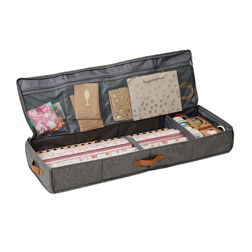 Onze cadeaupapier tas is ontworpen om orde te brengen in je inpakaccessoires. Met een royale capaciteit biedt deze tas ruimte voor ongeveer 20 inpakpapierrollen van 70-90 cm lengte. Daarnaast zijn er meerdere vakken om cadeaulinten, scharen en plakband overzichtelijk op te bergen. Alles wat je nodig hebt voor het inpakken van cadeaus vind je eenvoudig terug in deze praktische opbergtas.