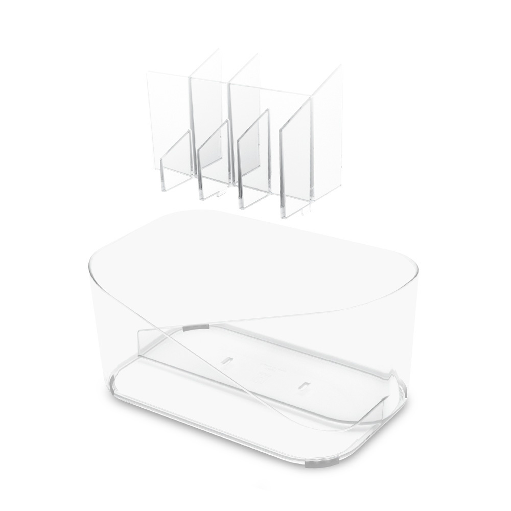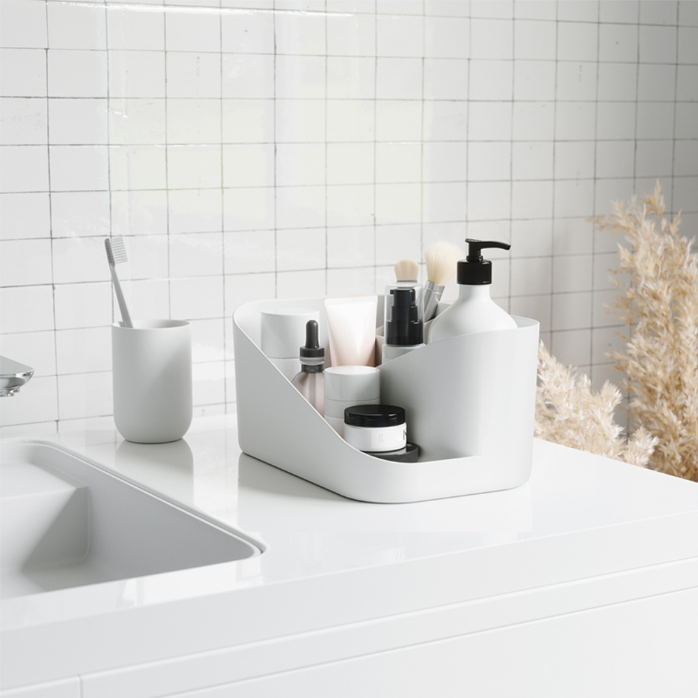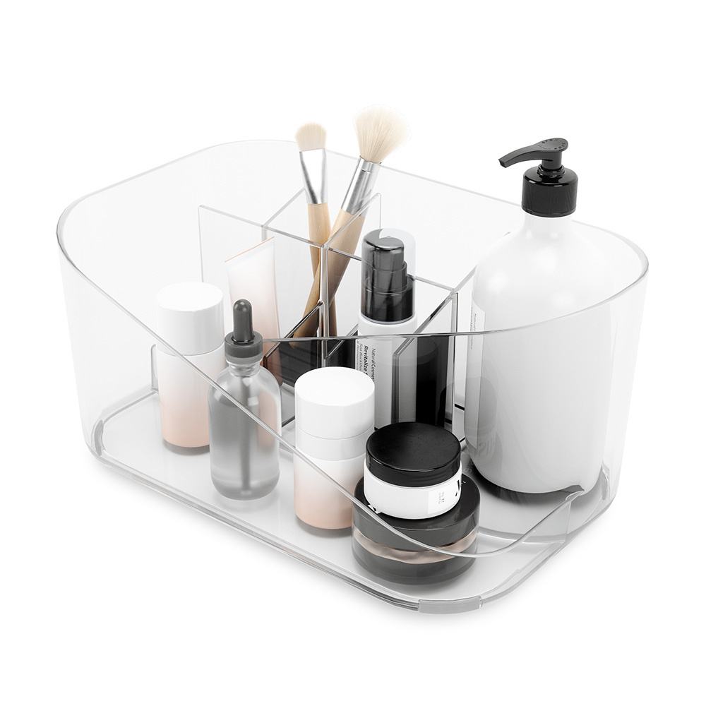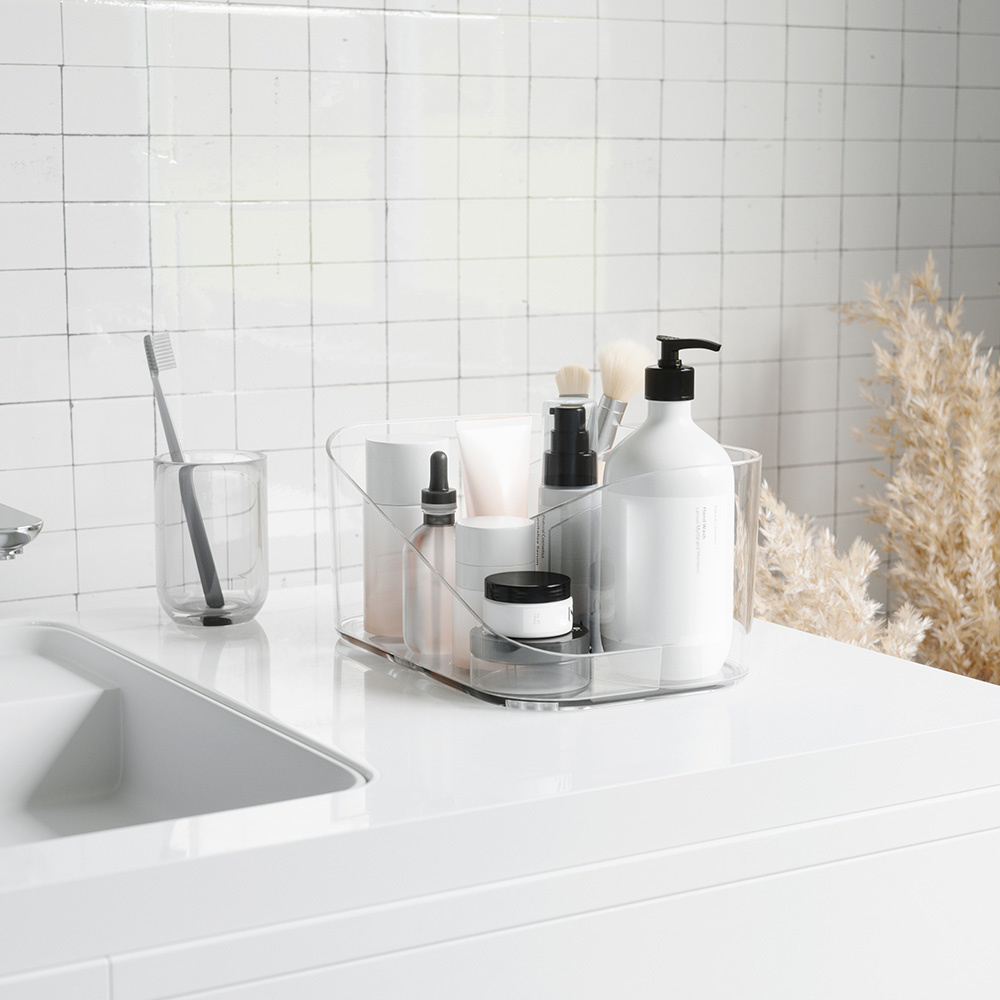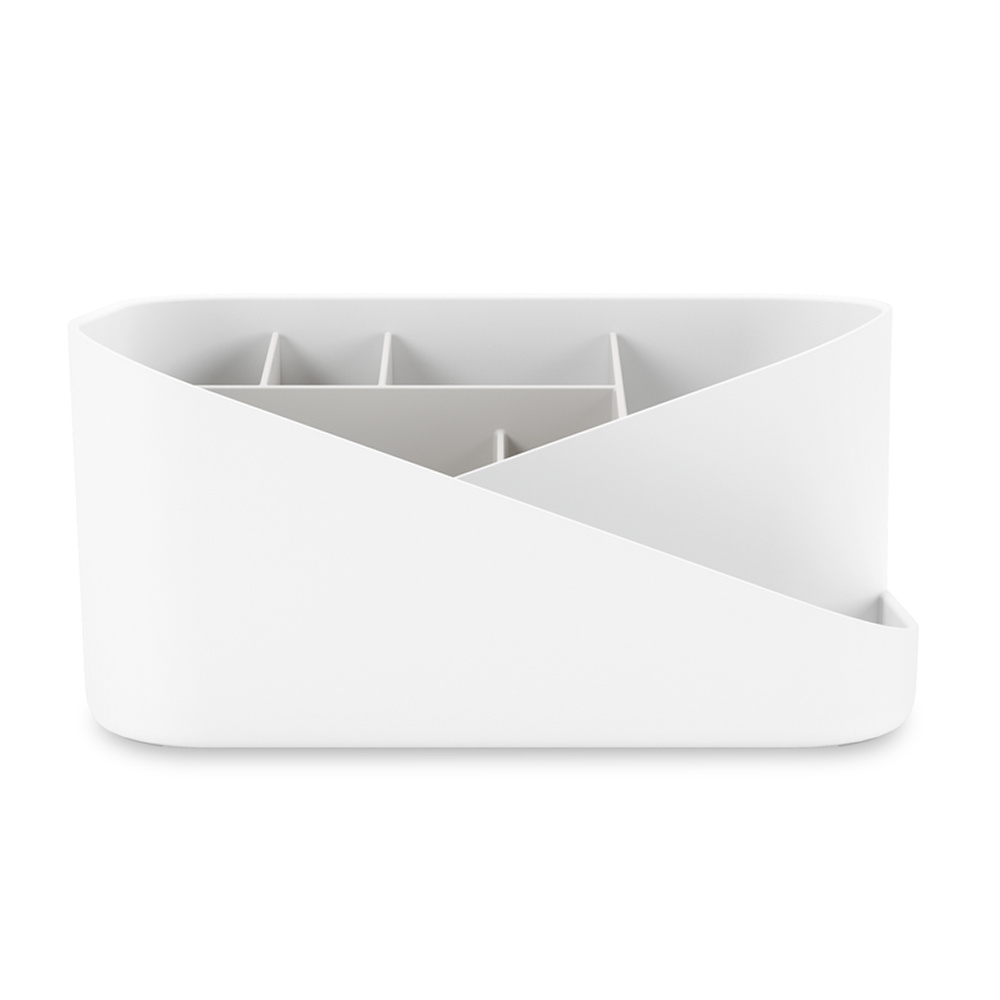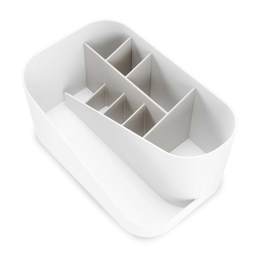 Voortaan heb je al je make-up en andere verzorgingsproducten bij elkaar liggen. En ook de vraag ‘hoe richt ik de wastafel in de badkamer netjes in?’ is met deze cosmetica display beantwoord. Je hoeft alleen maar deze wastafel organizer op je wastafel of nachtkastje te zetten en je kan al je favoriete producten die je dagelijks gebruikt in de make-up display opbergen. Gebruik de negen verschillende soorteervakjes om alles netjes te sorteren. En wil je naast make-up ook je haaraccessoires, zoals een föhn en krultang opbergen, dan is er van UMBRA ook nog een handige föhnhouder met verdeelschotten.