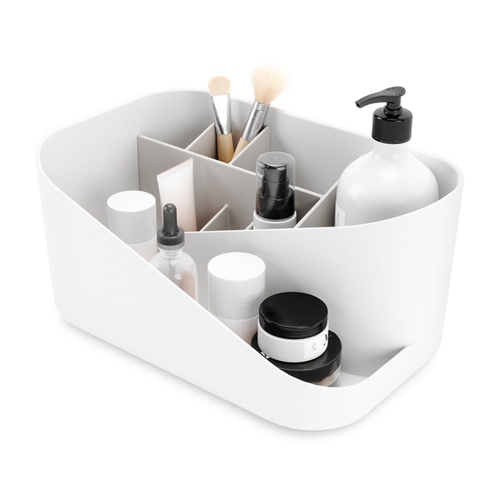 Deze cosmetica display is gemaakt van hard kunststof en is er in een transparante of witte uitvoering met lichtgrijze verdeelschotten. Deze zijn ook uitneembaar. Hierdoor kan je de make-up display netjes indelen en goed schoonmaken. In totaal heeft de wastafel organizer 9 sorteervakken van verschillende groottes. In totaal is de cosmetica display 27 cm breed, 17 cm diep en 13 cm hoog.