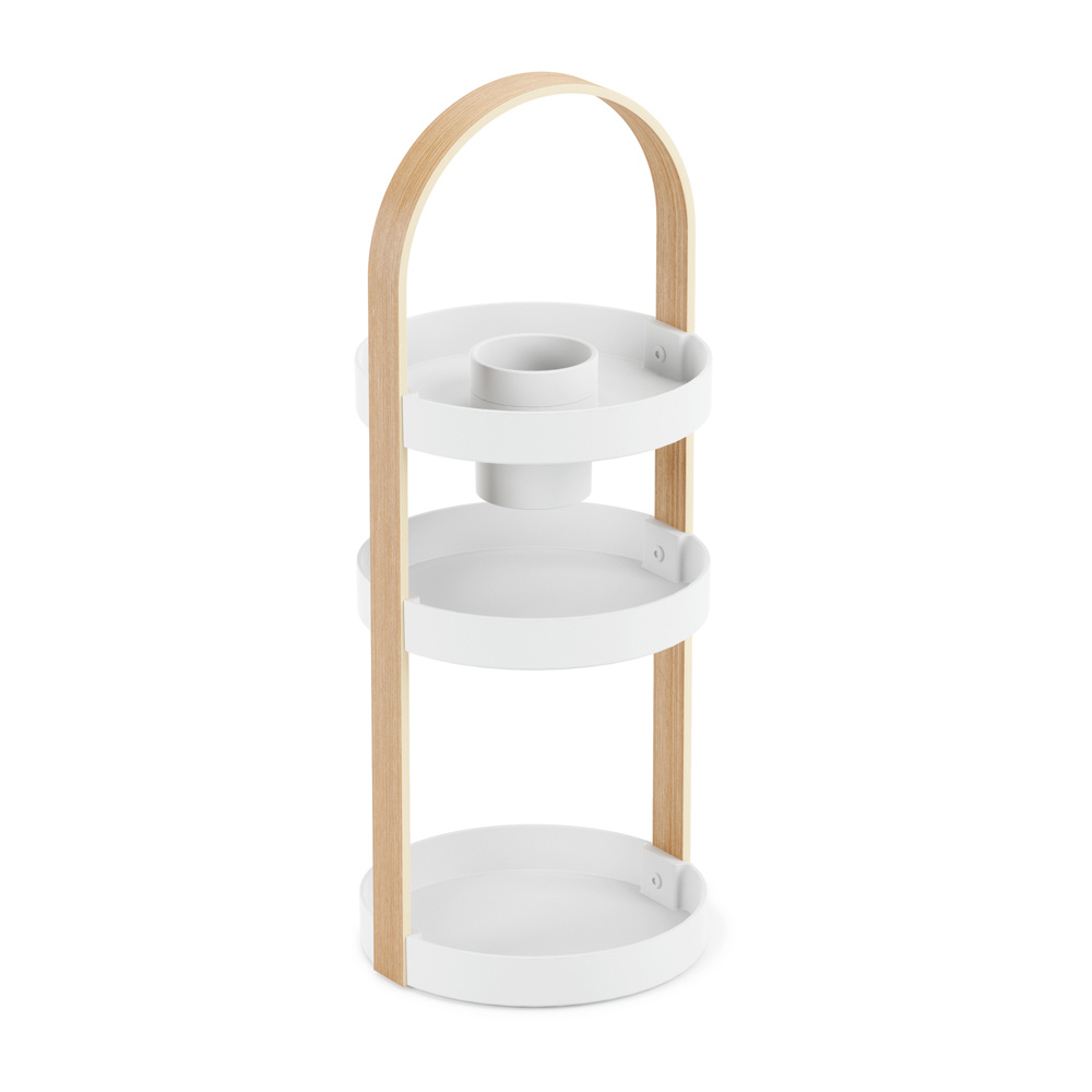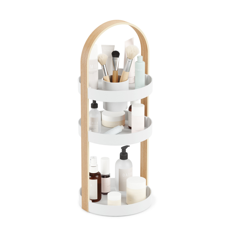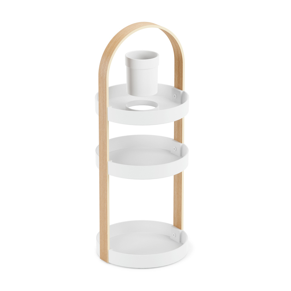Vanaf nu kun je al je verzorgingsproducten op één plek bewaren met deze wastafel organizer van UMBRA, perfect voor elke beauty-guru! Door de verschillende etages kun je je make-up en verzorgingsproducten per categorie indelen. Je kunt hem eenvoudig optillen en meenemen naar een andere ruimte door het grote houten handvat. Deze cosmetica organizer is flexibel inzetbaar, het is namelijk ook goed te gebruiken voor het opbergen van je favoriete sieraden. Of, gebruik het bij je (thuis)werkplek om schrijfwaar en andere kantoorbenodigdheden in op te bergen.