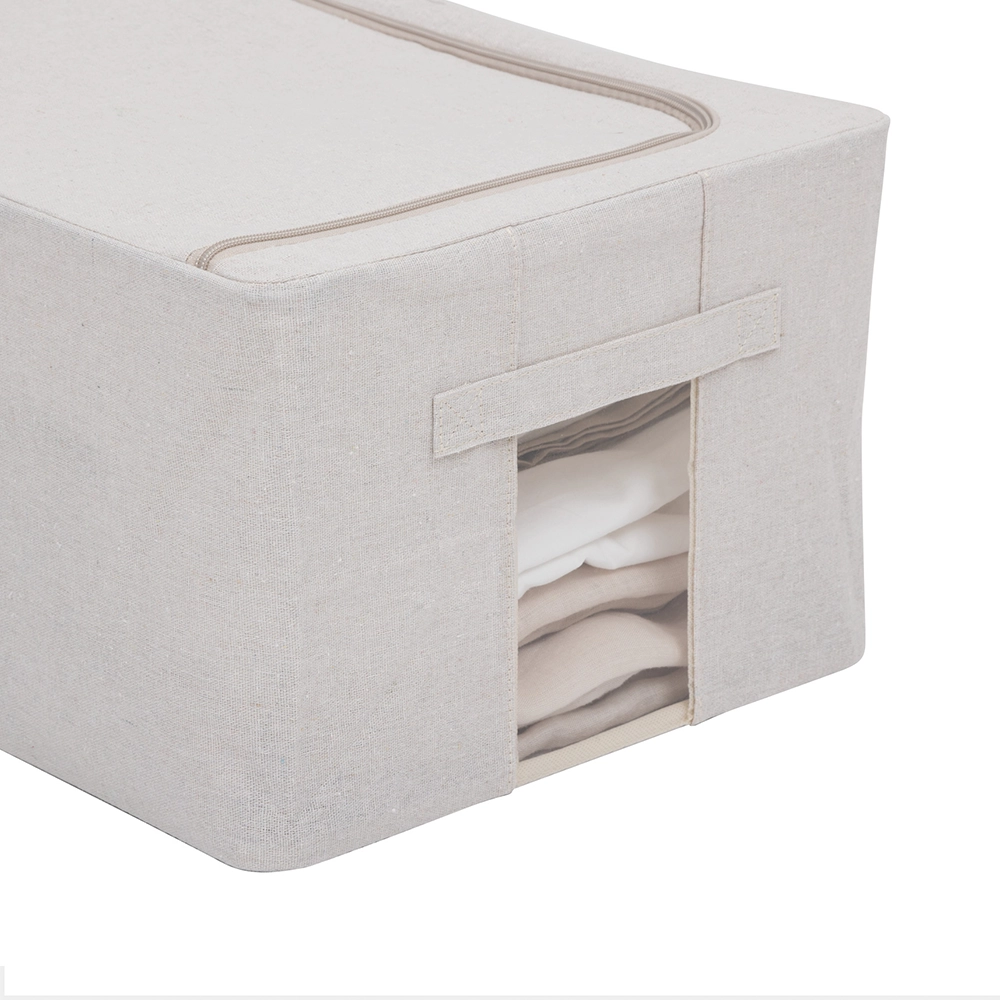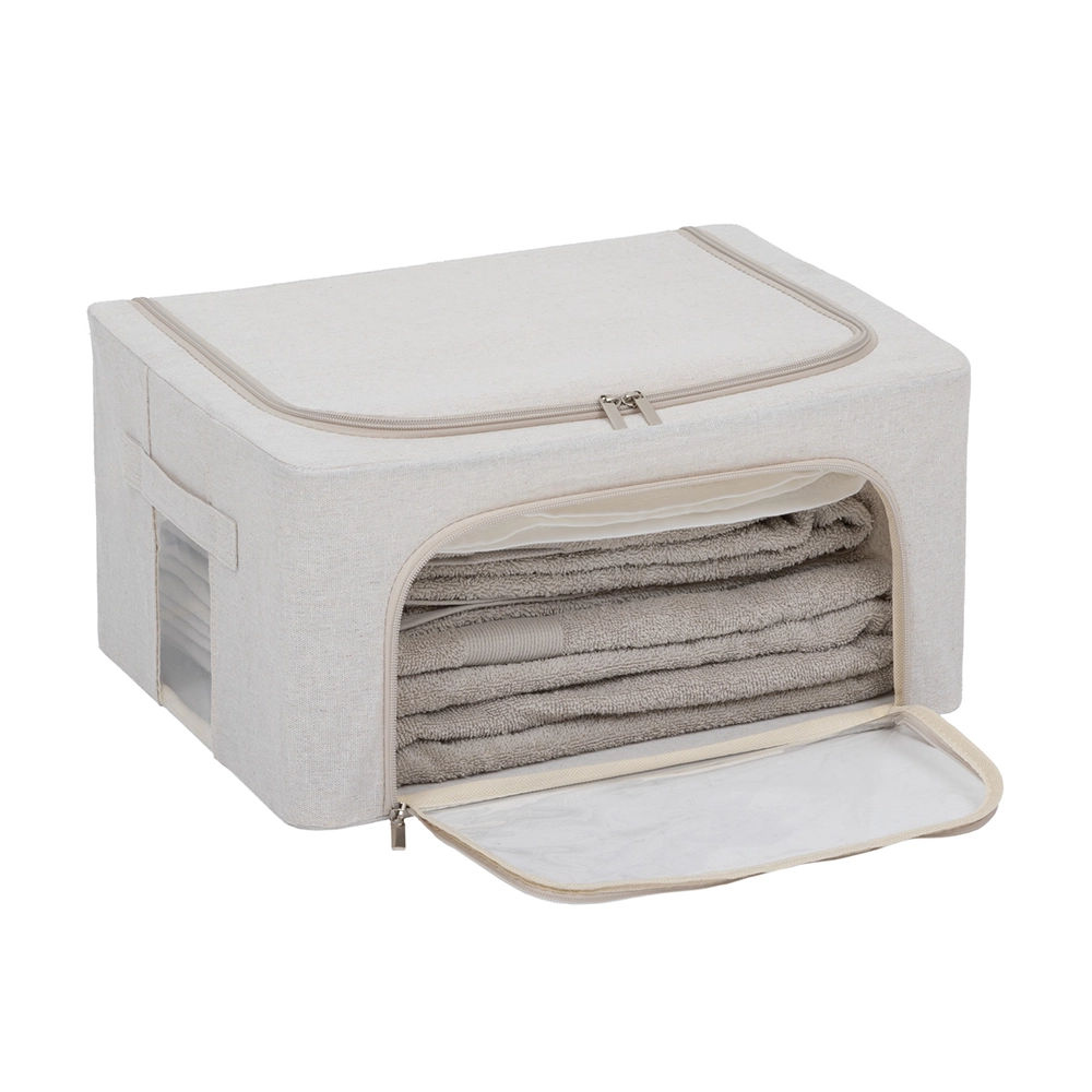 Dankzij de stevige constructie en het metalen frame blijft de tas rechtop staan, zodat je eenvoudig toegang hebt tot de inhoud. Deze dekbed opbergtas is gemaakt van hoogwaardig polyester en heeft een transparante voorzijde en een kijkvenster aan de zijkant, waardoor je in één oogopslag ziet wat erin zit. De dubbele opening met rits, zowel aan de bovenkant als aan de voorzijde, maakt het extra makkelijk om beddengoed of kleding op te bergen en eruit te halen. De handige zijhandgreep zorgt ervoor dat je de opbergtas eenvoudig kunt verplaatsen. Verkrijgbaar in twee formaten: de medium variant (40 cm breed, 20 cm diep en 31 cm hoog) en de large variant (50 cm breed, 35 cm diep en 25 cm hoog).