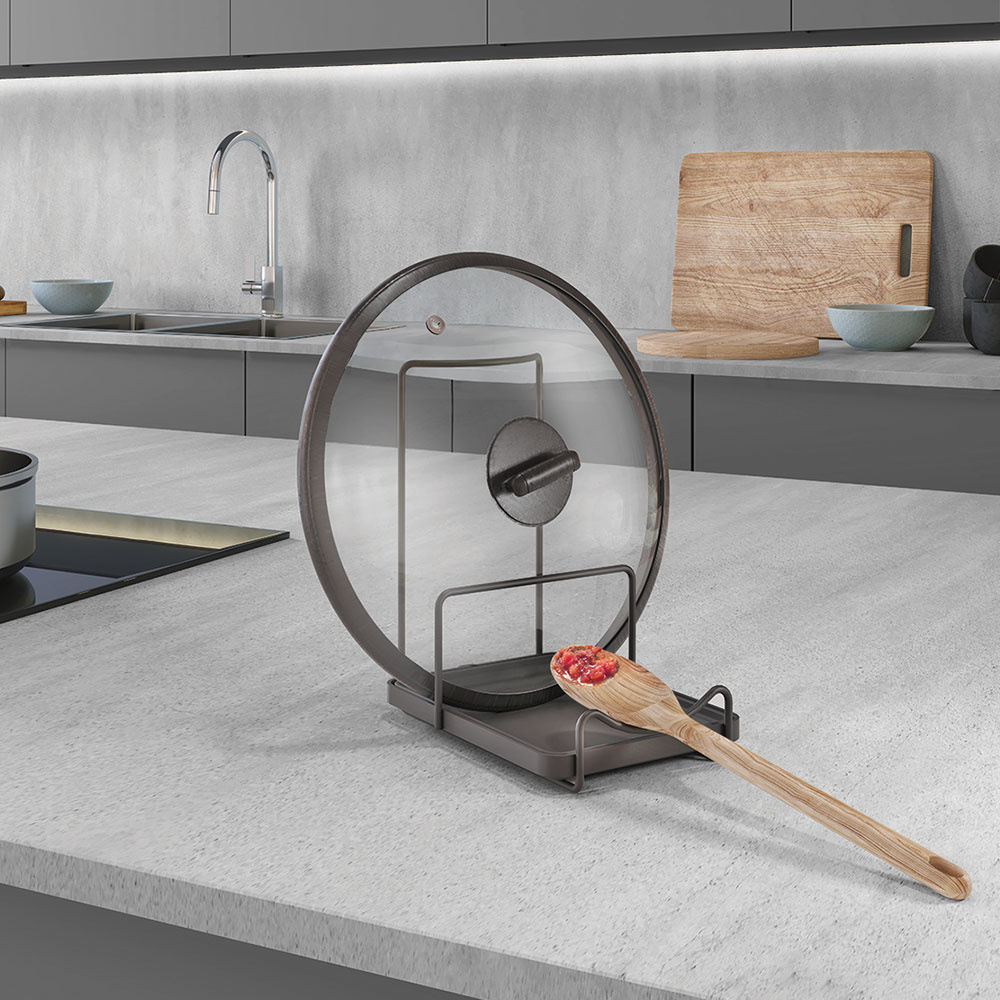 De zwarte lepelhouder is gemaakt van stevig metaal met Touch-Therm coating, dat de houder beschermd tegen roest en krassen. De houder is geschikt voor zowel lepels als deksels en beschikt over een kunststof bakje dat uitneembaar is. De dekselhouder is 12 cm breed, 17 cm diep en 19 cm hoog.