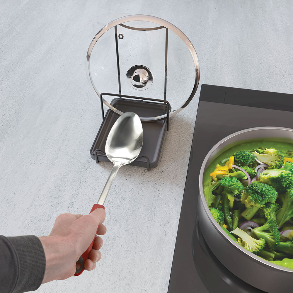 Deze lepelhouder is ideaal voor bij het koken! De houder heeft plaats voor een pollepel, een deksel, en heeft ook nog een uitneembaar lekbakje.