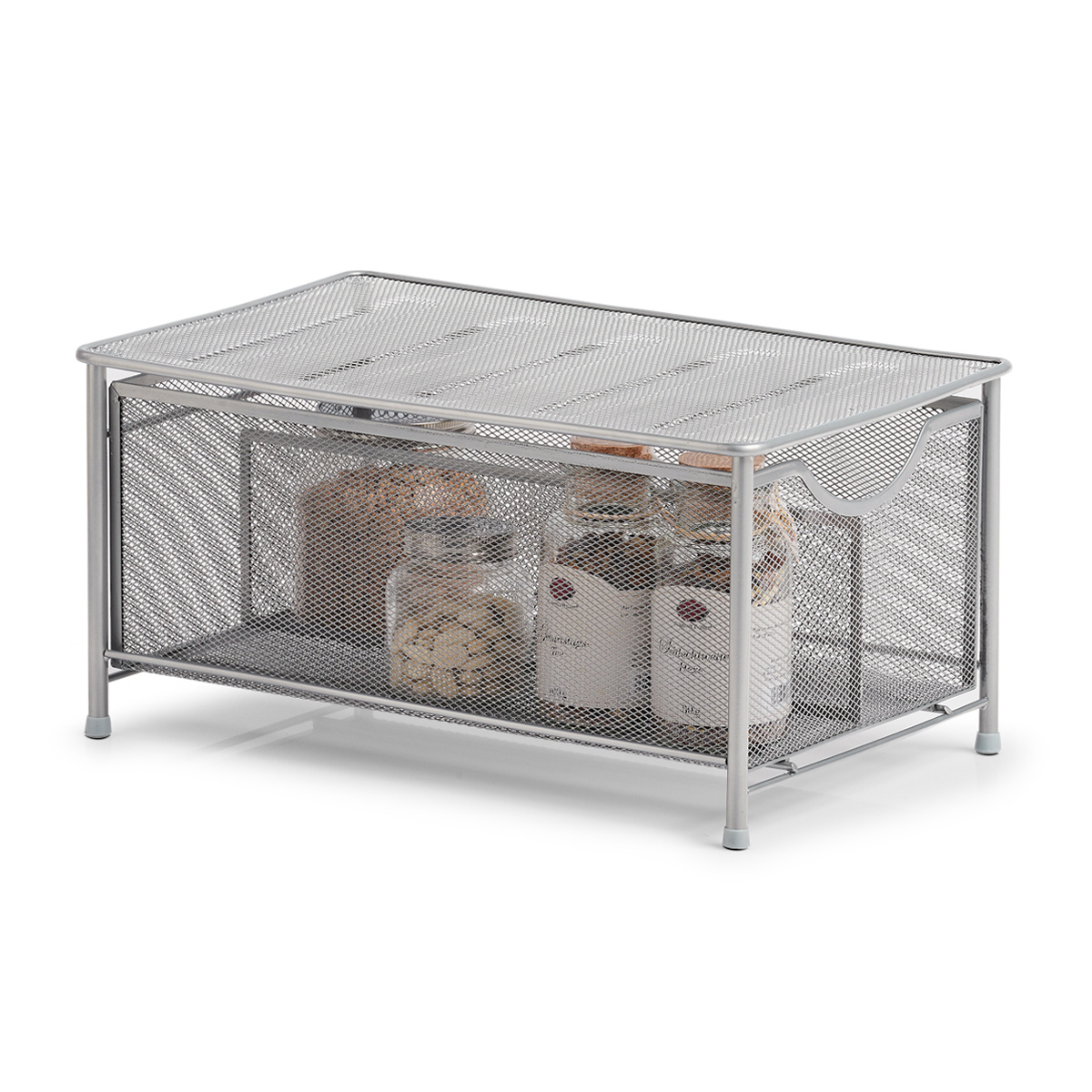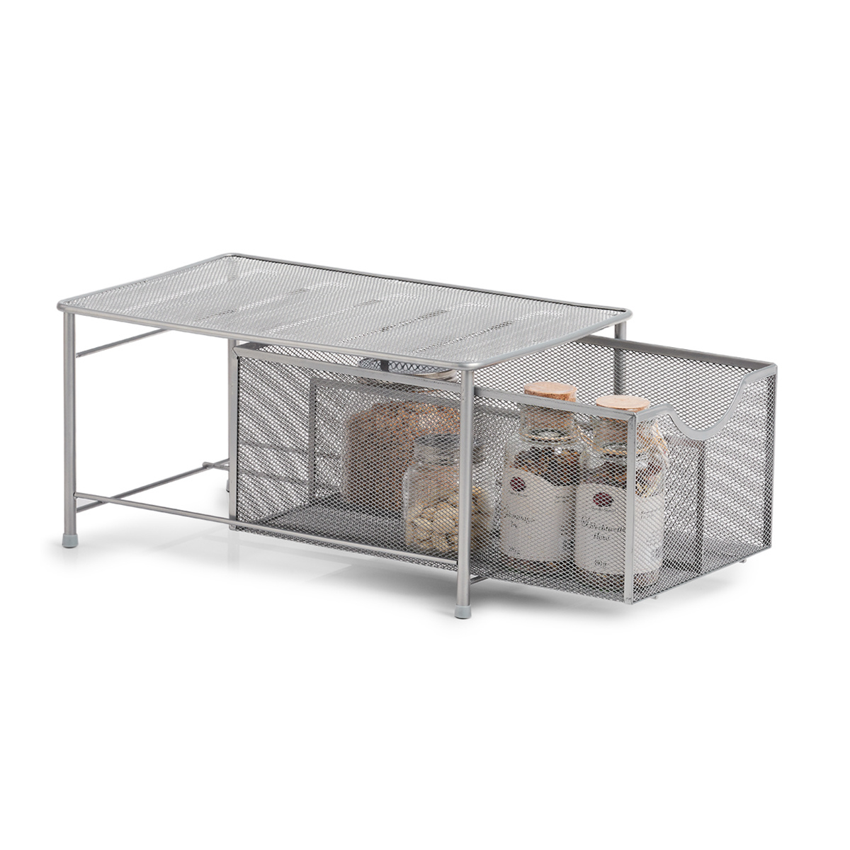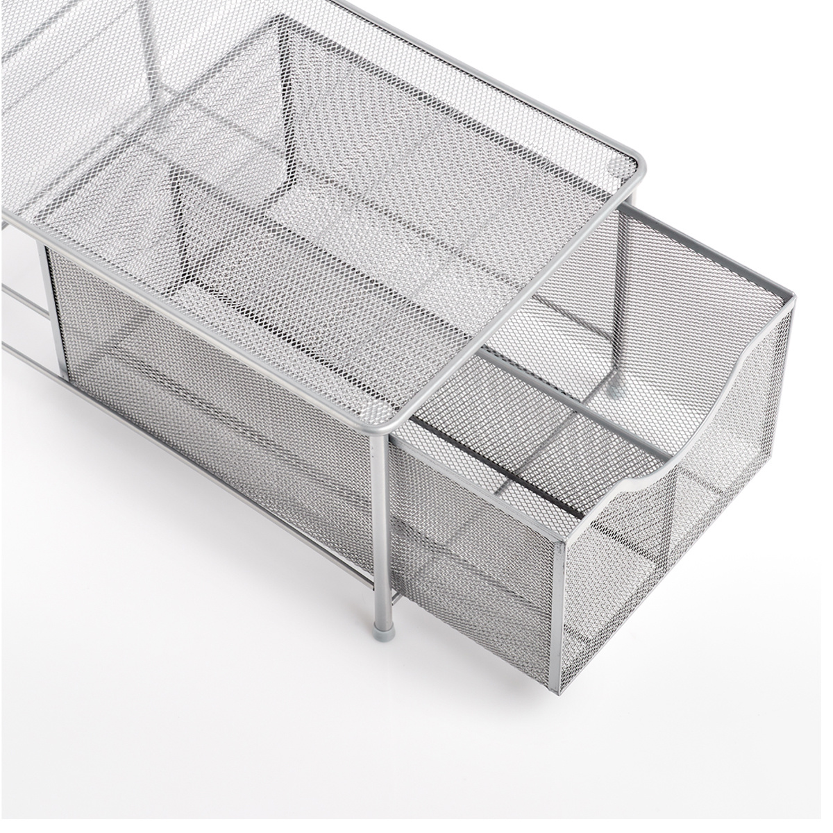 Deze handige zilveren uitschuifbare mand is gemaakt van gepoedercoat metaal en eenvoudig met een natte doek te reinigen. De lade is uitschuifbaar en de compartimenten zijn gemakkelijk toegankelijk doordat de lade helemaal kan worden uitgetrokken. De rubberen anti-slip pootjes zorgen voor een stevige houvast zodat het opbergrekje stevig blijft staan wanneer de lade wordt uitgetrokken, zelfs als hij vol is.