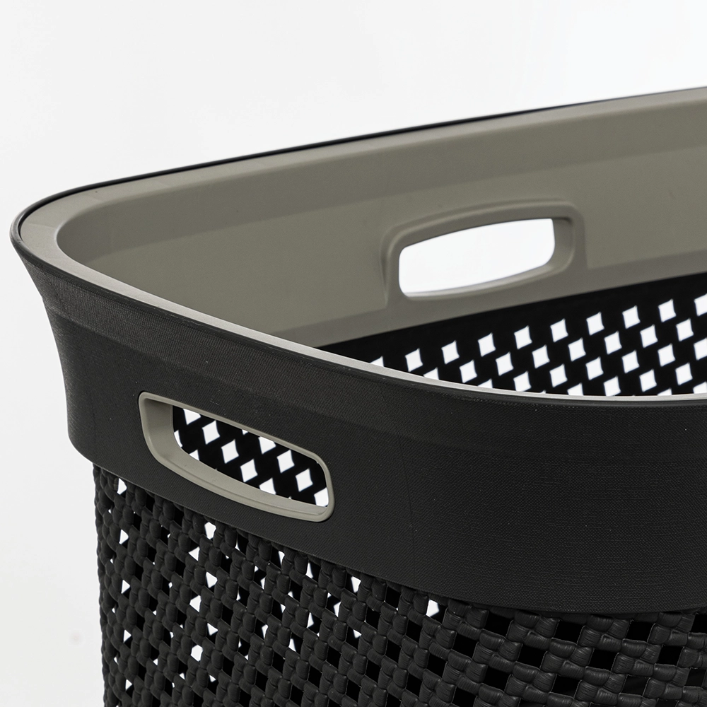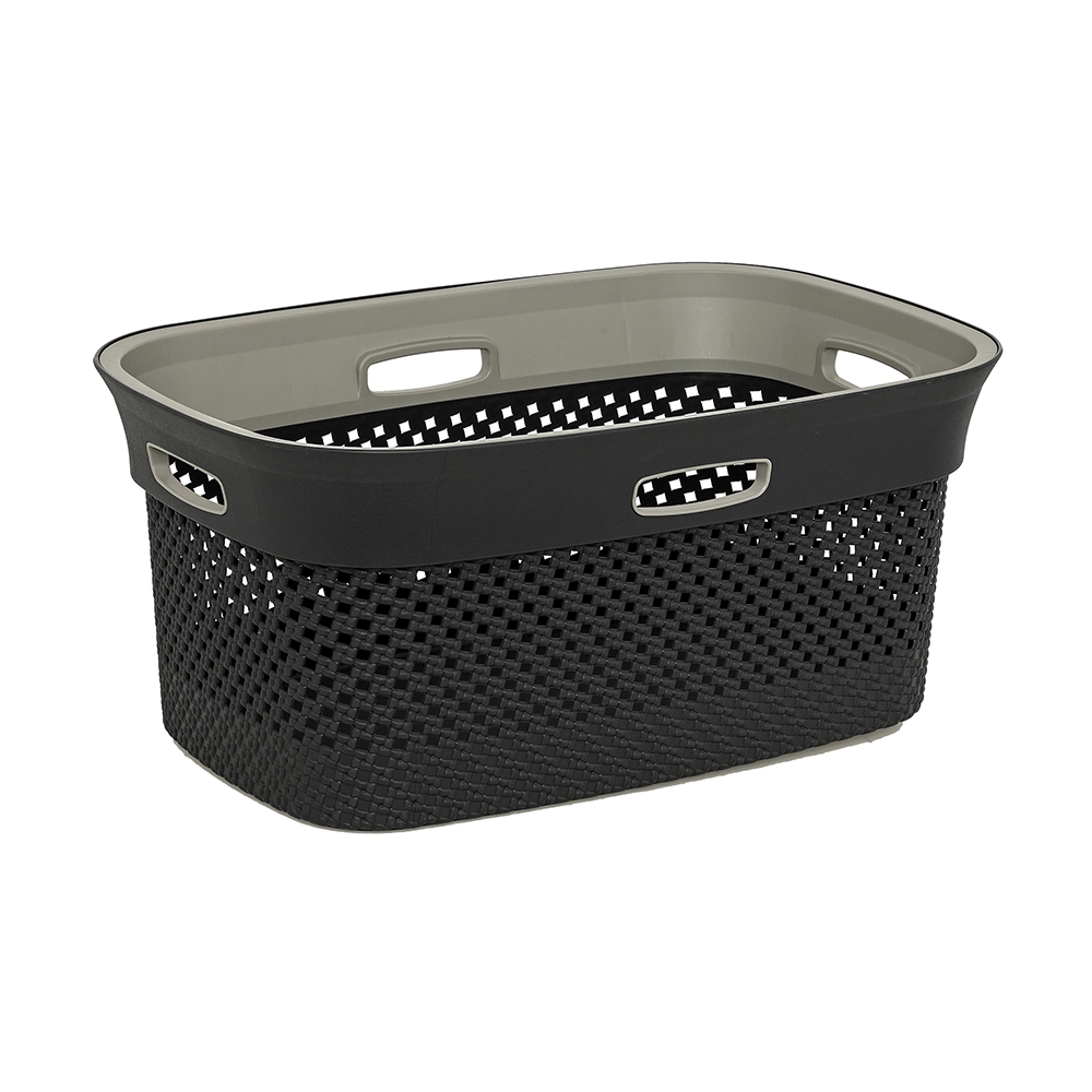De buitenzijde is donkergrijs, terwijl de binnenkant is afgewerkt met subtiele lichtgrijze details, wat zorgt voor een moderne uitstraling die in elke ruimte past. Gemaakt van hoogwaardig PP kunststof, is deze heupwasmand niet alleen kwaliteitsvol, maar ook zeer licht van gewicht. Met een gewicht van slechts 1,2 kg is deze wasmand gemakkelijk te dragen, vooral dankzij de handvatten aan alle vier zijden, die zorgen voor optimaal draagcomfort. De kleine luchtgaatjes in de zijkanten van de heupwasmand zorgen ervoor dat je wasgoed goed geventileerd blijft, waardoor onaangename geuren en schimmelvorming worden voorkomen.