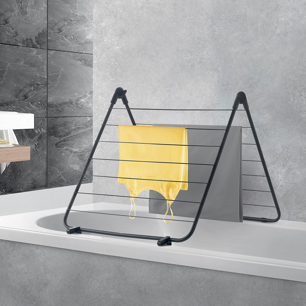 Het droogrek voor over de badkuip is gemaakt van roestbestendig metaal en heeft een stevige constructie die voor stabiliteit zorgt. De zwarte epoxy coating houdt het droogrek in uitstekende staat, zelfs na langdurig gebruik. Met afmetingen van 51 cm breed en 55 cm hoog wanneer deze als een driehoek is uitgeklapt, en een volledig gestrekte lengte van 110 cm, biedt dit rek voldoende ruimte voor een kleine hoeveelheid wasgoed. Tevens is het compact genoeg om eenvoudig op te bergen.