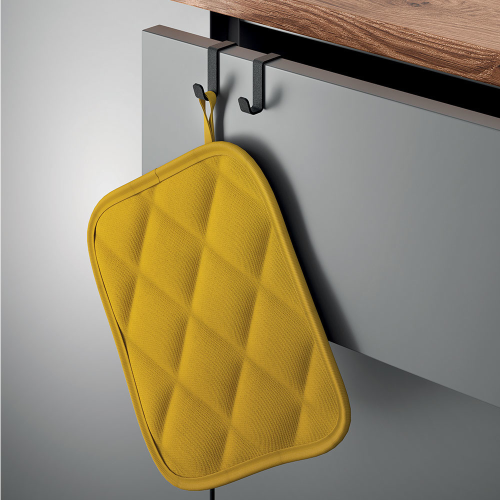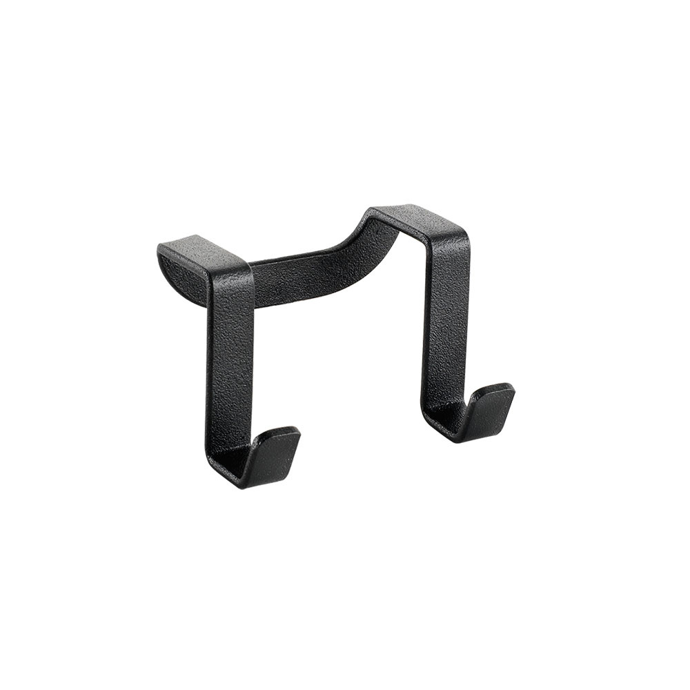 Dit handdoekhaakje heeft twee haakjes en is gemaakt van metaal met een beschermende coating. Het haakje past over nagenoeg alle keukenkastje (max. 2 cm dikte) en heeft een matzwarte kleur. De houder is 6 cm breed, 4 cm diep en 4 cm hoog.
