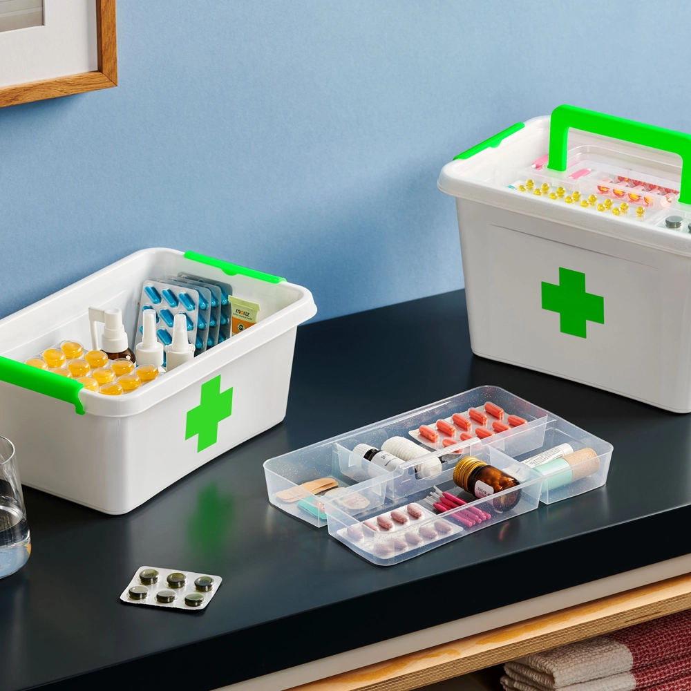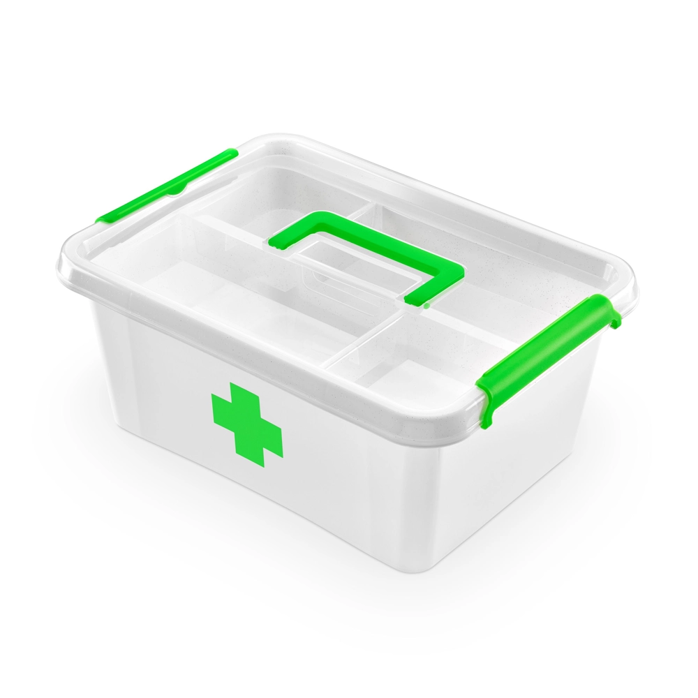 Dankzij het transparante deksel en inzet met glitter blijft de inhoud overzichtelijk en toegankelijk, terwijl het groene handvat en de clips zorgen voor een stevige sluiting en gemakkelijk transport. Deze ehbo opbergdoos is niet alleen functioneel, maar ook duurzaam en veelzijdig. De box is voedselveilig (BPA-vrij), vriezerbestendig en vaatwasmachinebestendig, met een temperatuurbereik van -30 tot +90 graden. Dit maakt hem ideaal voor zowel huishoudelijk gebruik als onderweg. Het iconische groene kruis op de zijkant maakt de box eenvoudig te herkennen in noodgevallen. Verkrijgbaar in vier verschillende formaten, zodat je de perfecte maat kunt kiezen voor jouw behoeften. Beschikbaar in de volgende formaten: