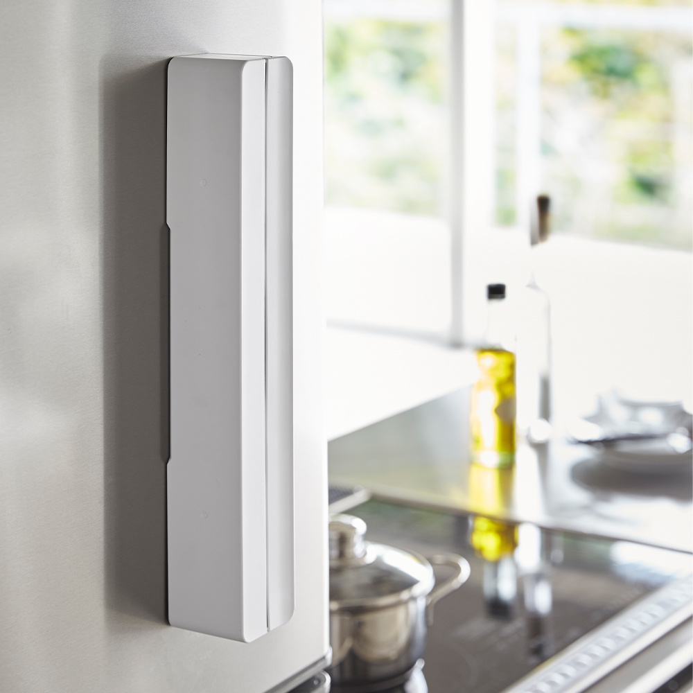 Eenvoudige en stijlvolle magnetische foliehouder van Yamazaki. Ideaal voor huishoudfolie en aluminiumfolie; producten die je snel bij de hand wil hebben in de keuken en gemakkelijk wil kunnen afscheuren.
