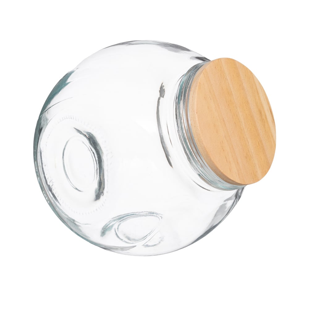 Leuke glazen voorraadpot met houten deksel in bol vorm. Geschikt voor koekjes en snoepjes, maar ook te gebruiken als opberger voor kruiden en pasta.