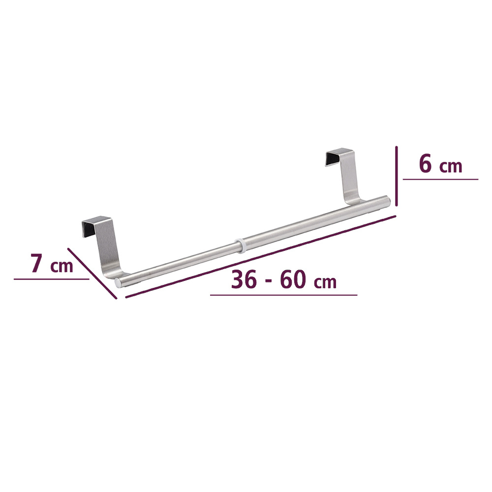 Deze uitschuifbare handdoekstang hang je gemakkelijk over een kastdeur of lade met een maximale dikte van 2 cm. Naast de keuken is de telescopische handdoekhouder ook te gebruiken in de badkamer.