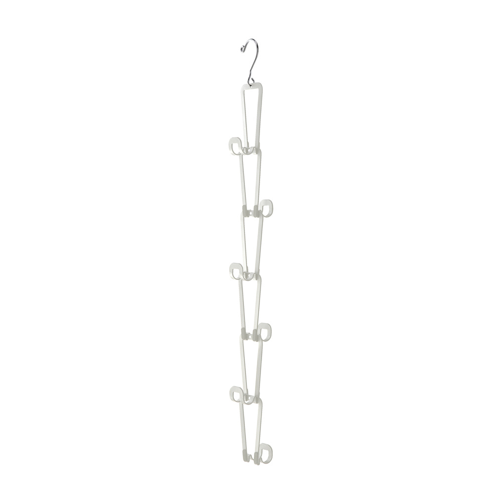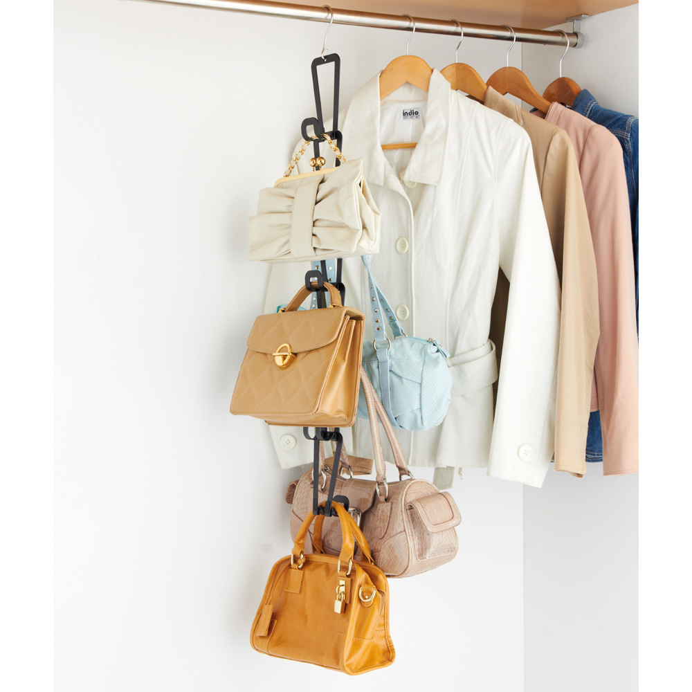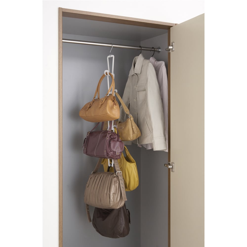 Met deze handtas organizer ruim je netjes jouw tassen op. Aan de haken kun je zes handtassen kwijt, en bespaar je gemakkelijk ruimte in je kledingkast! Je kunt de lengte zelf aanpassen, omdat alle zes de haken afneembaar zijn. De organizer is op te hangen in een kast of aan de wand.