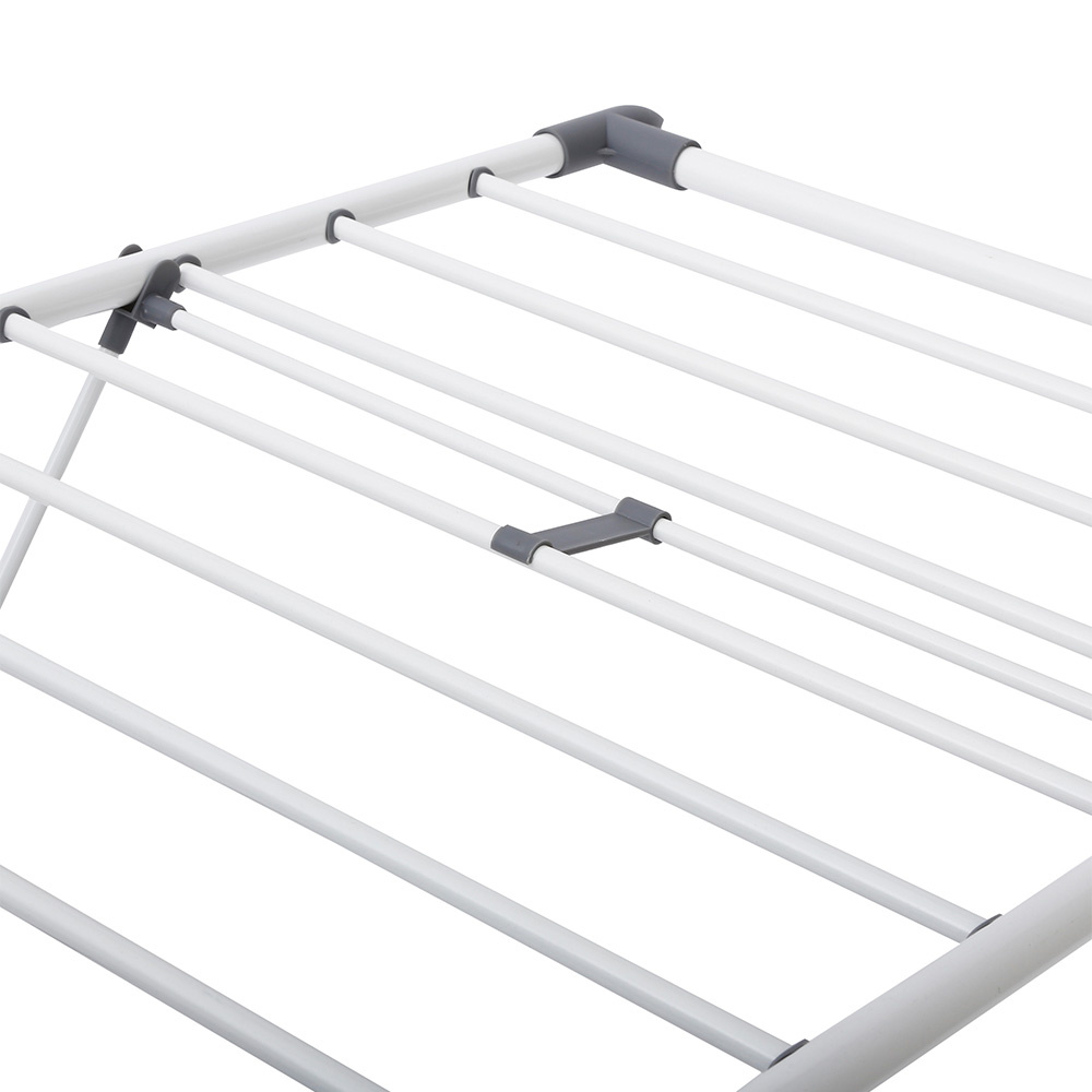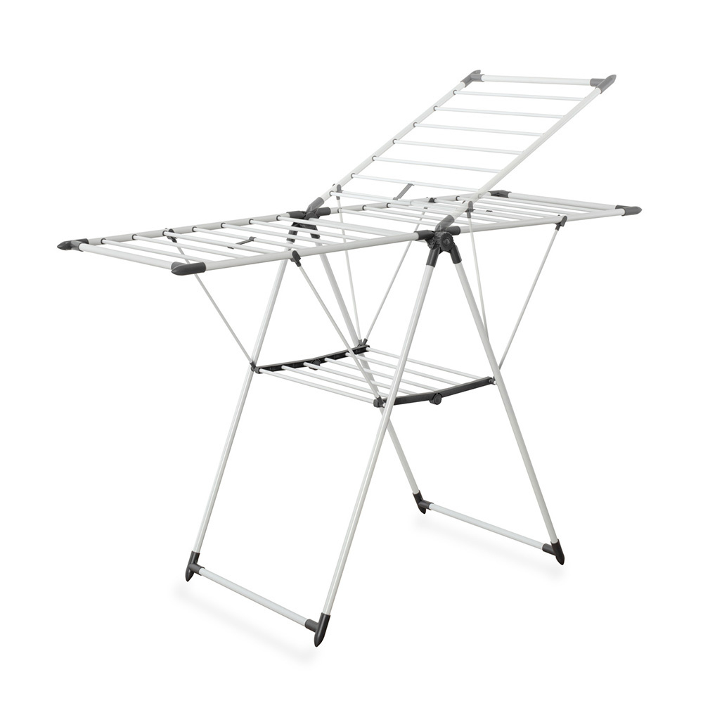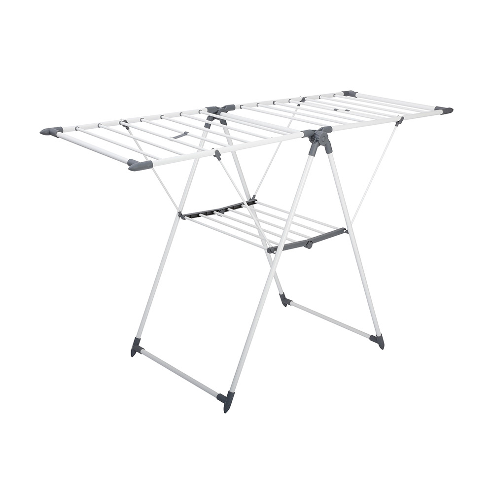 Dit staand wasrek zorgt voor veel hangruimte voor je wasgoed. Door de antislip voeten zullen de wasrekken niet verschuiven en is je vloer ook beschermt tegen krassen. Het wasrek is gemakkelijk in te klappen en te vergrendelen. Het 'large' model is aangevuld met extra hangaccessoires voor je sokken en schoenen te laten drogen.