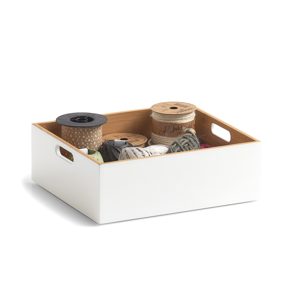 Opbergkist van hout met een witte kleur aan de buitenkant en een lichtbruine bamboe kleur aan de binnenkant. De houten opbergbak heeft handvatten aan de voor- en achterkant en is beschikbaar in twee hoogtes die op elkaar gestapeld kunnen worden. Beide houten opbergboxen zijn 30 cm breed en 27 cm diep. Het lage formaat is 6 cm hoog en de grotere versie 11 cm.