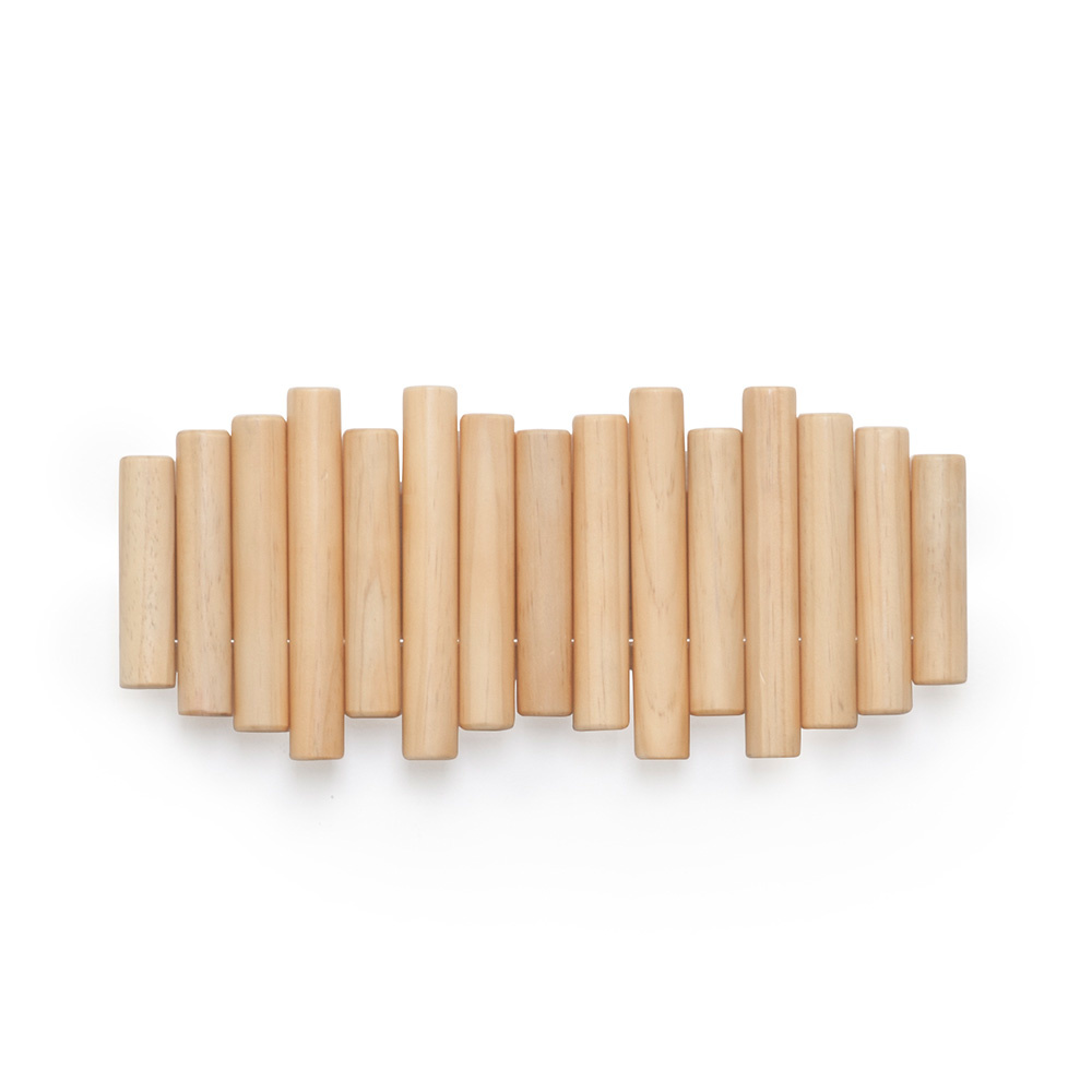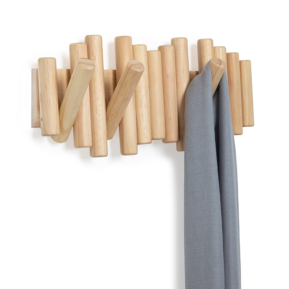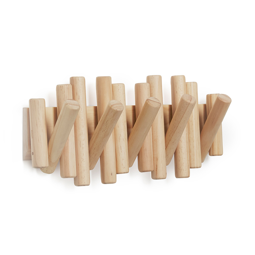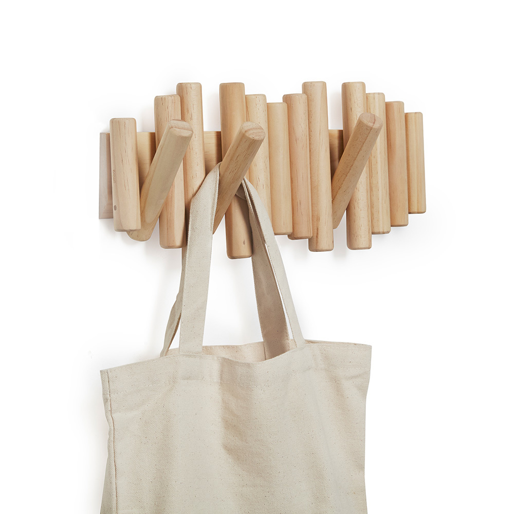 Deze prachtige houten kapstok voor aan de muur lijkt een kunstwerk, maar zodra je de vijf haken openklapt kun je er jassen, sjaals en tassen aan ophangen.