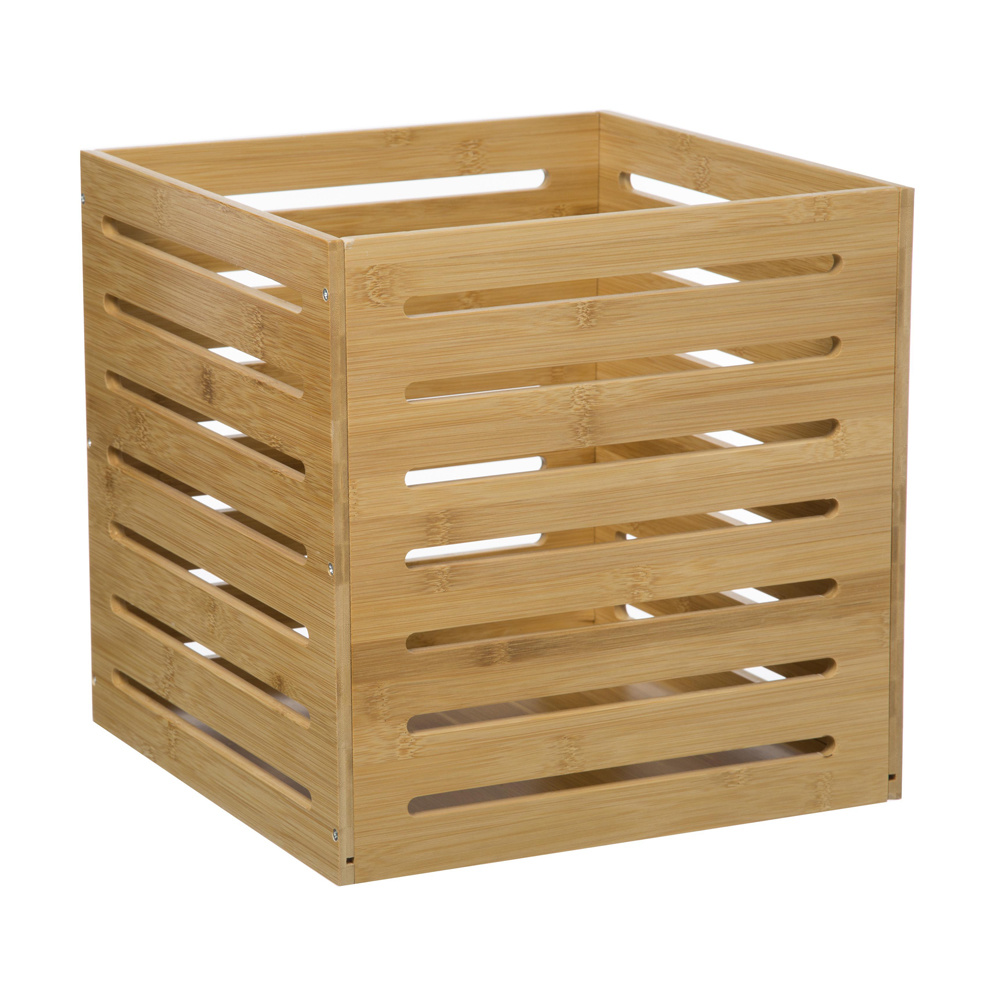 Een stevige bamboe kist waar je allerlei soorten producten in kunt opbergen. Hij is eenvoudig te monteren en heeft een sterk robuuste uitstraling. Omdat de kist geen deksel heeft en openingen heeft aan de zijkant, kun je gemakkelijk de inhoud zien.