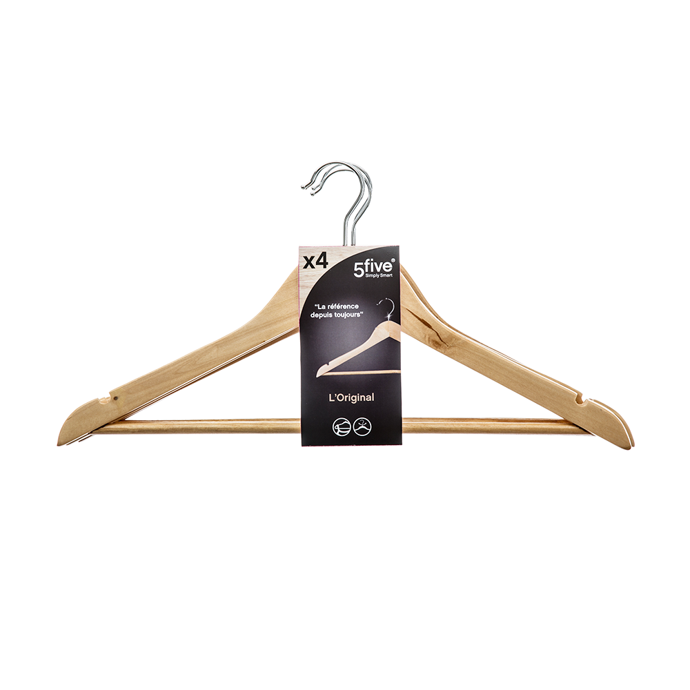 De houten kledinghangers van Five® zijn de perfecte keuze voor wie zijn kleding netjes en georganiseerd wil ophangen. Deze set is verkrijgbaar in een 4-delige of 8-delige variant.