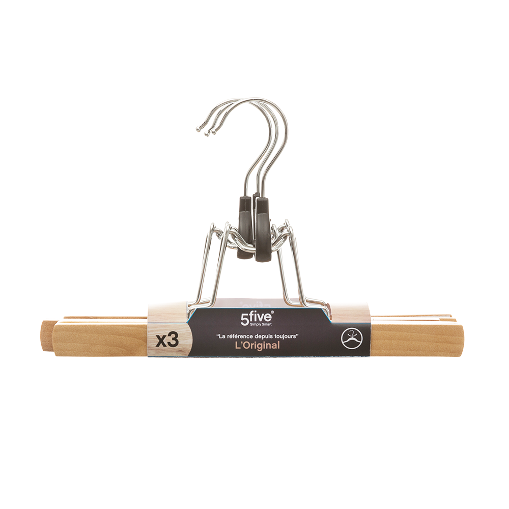 De cliphanger van Five® is de ideale oplossing voor het netjes ophangen van broeken, rokken of andere kledingstukken. Deze set van drie houten hangers is voorzien van een stevige metalen haak en een brede houten clip, waarmee je je kleding eenvoudig en kreukvrij kunt opbergen. Perfect voor wie zijn kledingkast georganiseerd en stijlvol wil houden.