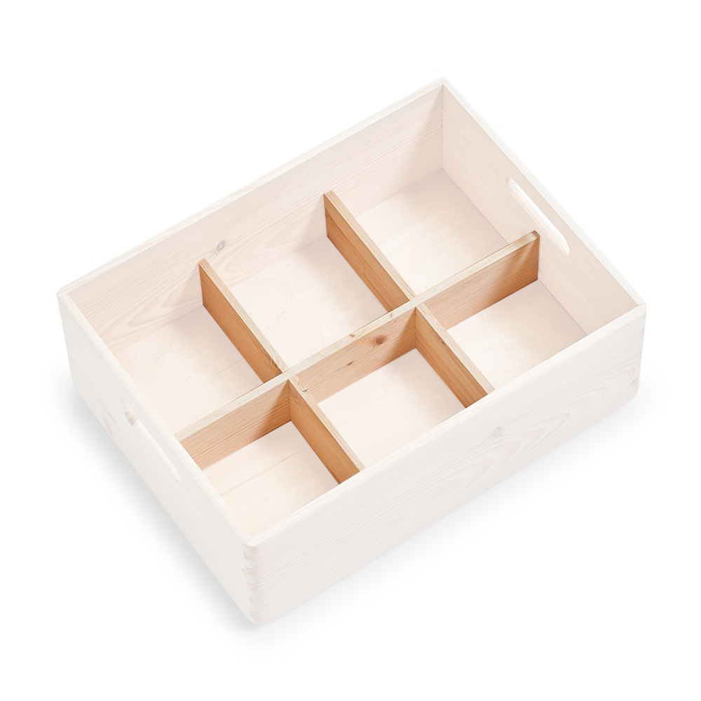 Een houten opbergbox om allerlei soorten voorwerpen in op te ruimen. Handig voor iedere ruimte, van de keuken tot en met de zolder. Ze zijn stapelbaar en dankzij de handvatten eenvoudig te verplaatsen. Dankzij een bij te bestellen inzetstuk voor vakverdelingen sorteer je eenvoudig en snel wat je wilt opbergen.