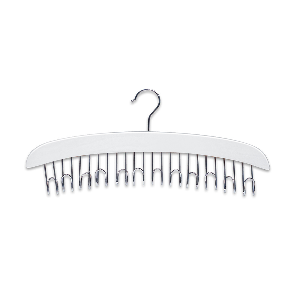 Deze riemhanger van hout en is er in een blanke of witte uitvoering. De hanger is 43 cm breed, 5,5 cm diep en 16,5 cm hoog. Het riem ophangsysteem heeft 12 ophanghaken van zilverkleurig metaal.