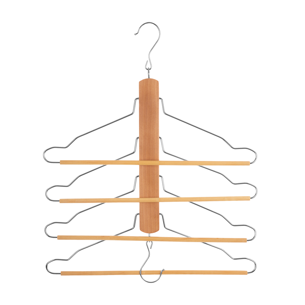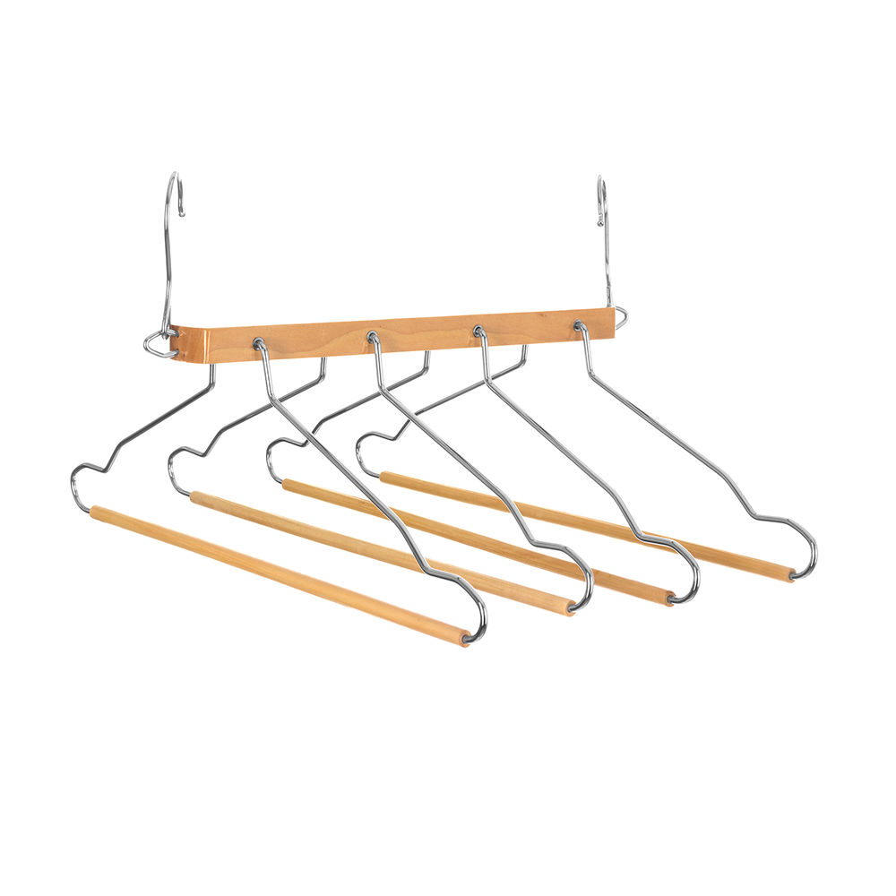 De shirt en broekhanger van Five® is de perfecte oplossing voor het efficiënt opbergen van je broeken of shirts. Deze houten kledinghanger biedt ruimte voor maar liefst vier kledingstukken en kan zowel verticaal als horizontaal worden gebruikt, waardoor je gemakkelijk ruimte bespaart in je kledingkast.