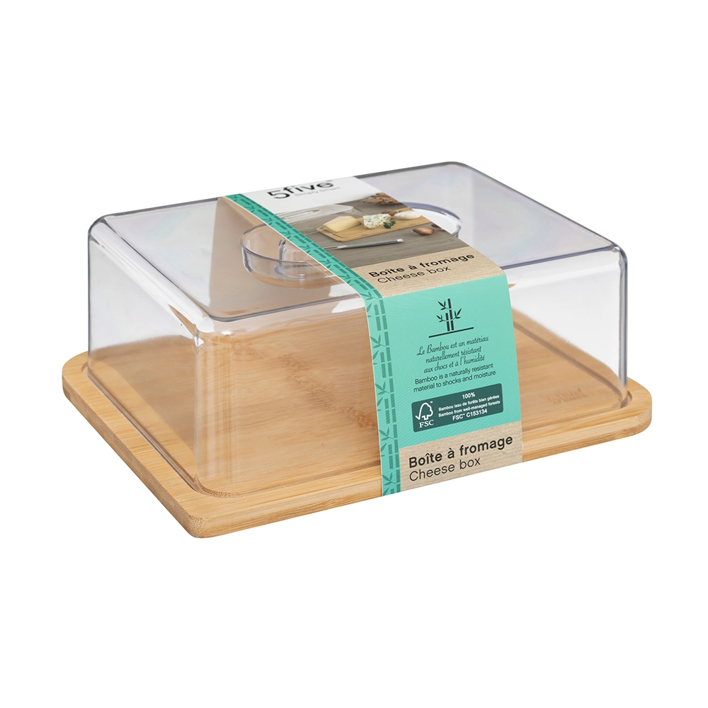 De kaasbak van Five® combineert functionaliteit met een modern design. Het gebruik van bamboe zorgt voor een natuurlijke en duurzame uitstraling, terwijl het PS kunststof deksel lichtgewicht en eenvoudig schoon te maken is. Deze kaasdoos is perfect voor gebruik thuis, tijdens feestjes of bij het serveren van een kaasplankje.