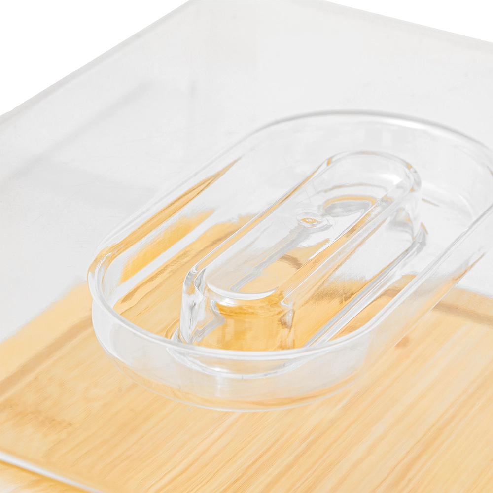 De binnenkant van de deksel biedt ruimte aan een kaas met een maximale maat van 20,9 x 15,4 cm, wat voldoende ruimte biedt voor verschillende soorten kaas. Deze kaasbak is ontworpen met oog voor detail en duurzaamheid. Het bamboe plateau, met een dikte van 1,1 cm, vormt een stevige basis voor het snijden en serveren van kazen. Het transparante deksel zorgt ervoor dat je de inhoud gemakkelijk kunt zien, terwijl het je kaas beschermt tegen uitdrogen. Of je nu harde kazen, zachte kazen of een mix van beiden wilt bewaren, deze kaasdoos biedt de ideale oplossing.