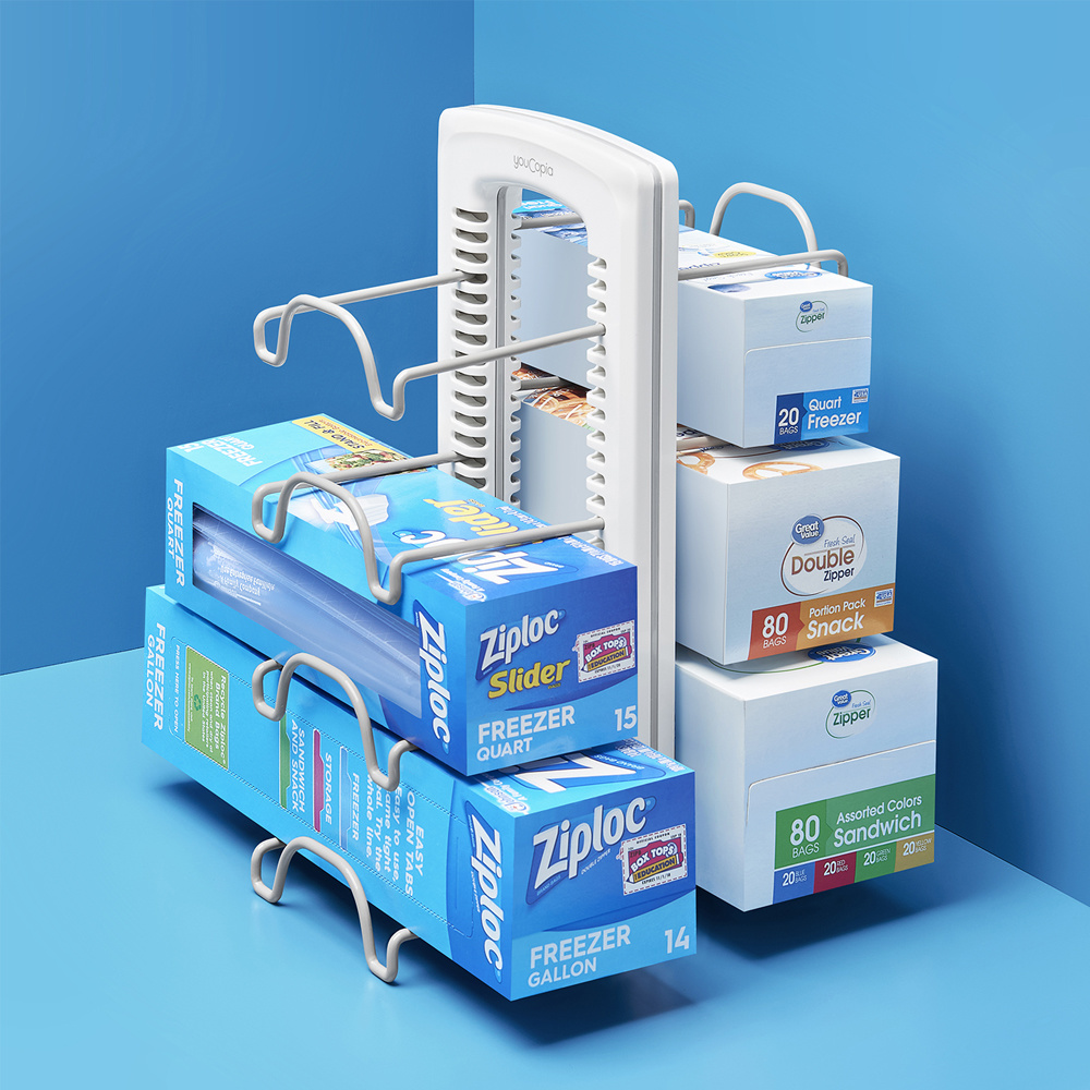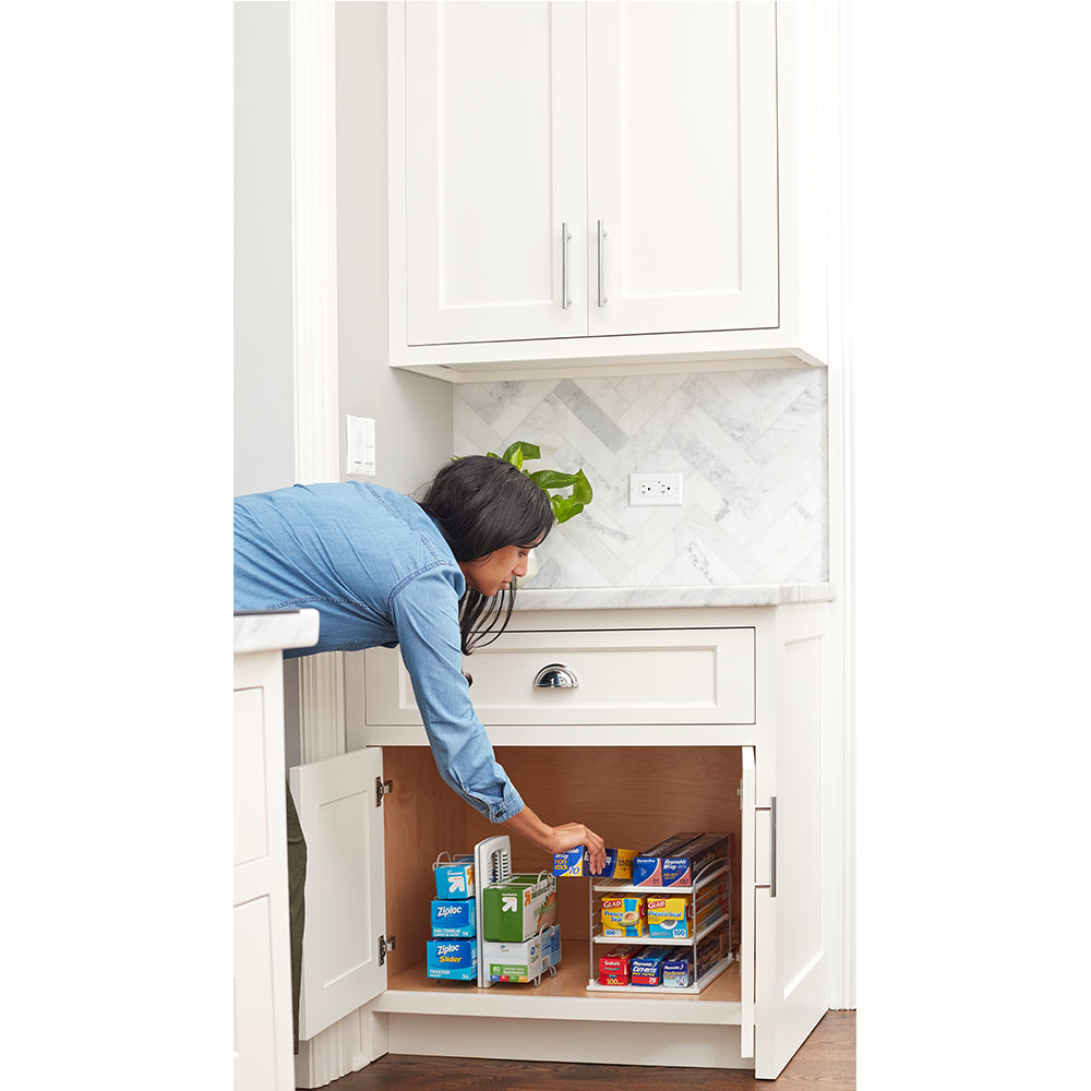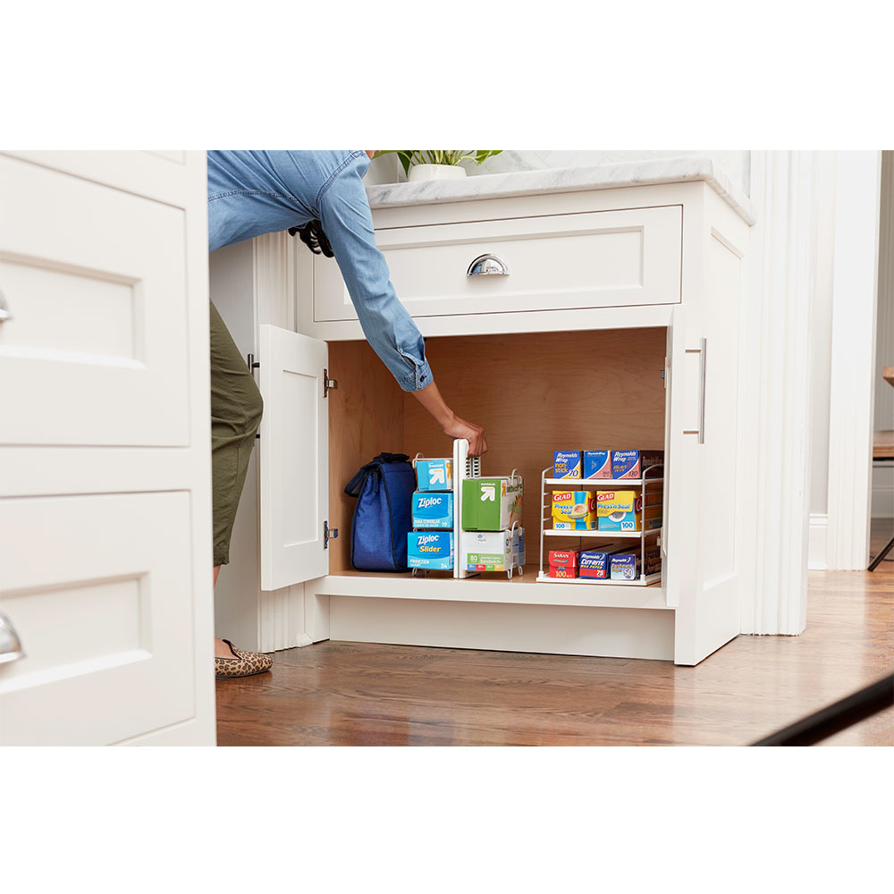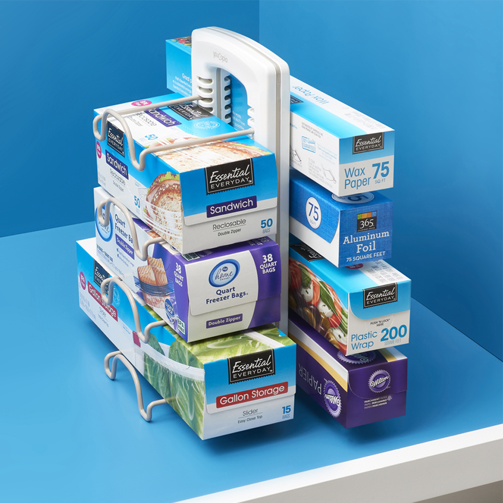 Een slimme keukenkast indeling zorgt voor meer plezier tijdens het bakken, koken en lunch maken! Vooral wanneer je spullen binnen handbereik liggen. Dit keukenkast rekje zorgt er niet alleen voor dat doosjes handig zijn opgeborgen, maar het dient ook als dispenser van folie, bakpapier, diepvrieszakjes en boterhamzakjes. De keuken organizer hoeft nooit in de weg te staan: je kan makkelijk ruimte creëren wanneer je dat nodig hebt. Dankzij de handgreep verplaats je de keuken organizer makkelijk van de kast naar het aanrecht en terug. Zo maak je slim gebruik van de hele ruimte in je keuken. Bekijk de gehele StoreMore® collectie van Youcopia voor vergelijkbare en bijpassende organizers.