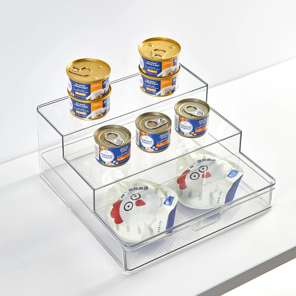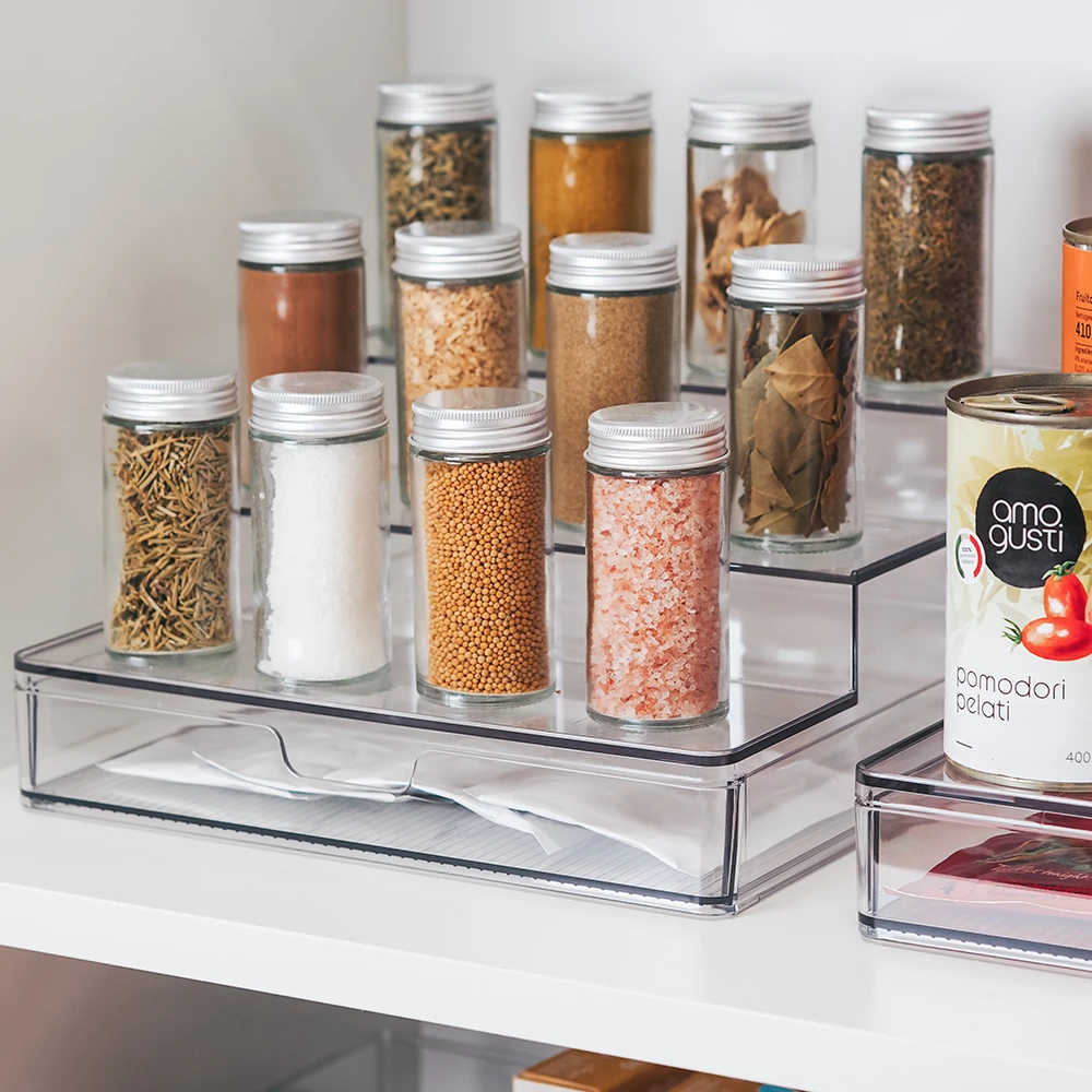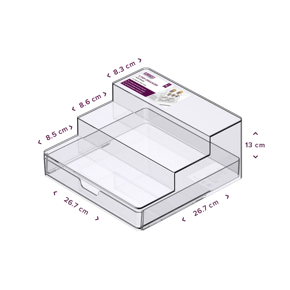 De organizer is gemaakt van recyclebaar PET kunststof dat BPA-vrij is. De 3 niveaus bieden genoeg ruimte voor al je blikjes en kruidenpotjes. Door de 3 traptreden heb je ook gemakkelijk toegang tot de producten die achterin je kast staan en zie je in één oogopslag wat je in huis hebt. Onderin zit een lade waarin je bijvoorbeeld kruidenzakjes opbergt. Daarnaast is het product voorzien van anti-slip pootjes zodat deze stevig op zijn plek blijft staan. Deze keukenkast organizer was je met de hand af en er geldt een garantie van maarliefst 12 maanden. De onderste en middelste trede zijn geschikt voor het opbergen van producten met een omvang van maximaal 8.6 cm, de bovenste trede voor 8.4 cm. Er zijn 2 formaten beschikbaar met de volgende afmetingen: