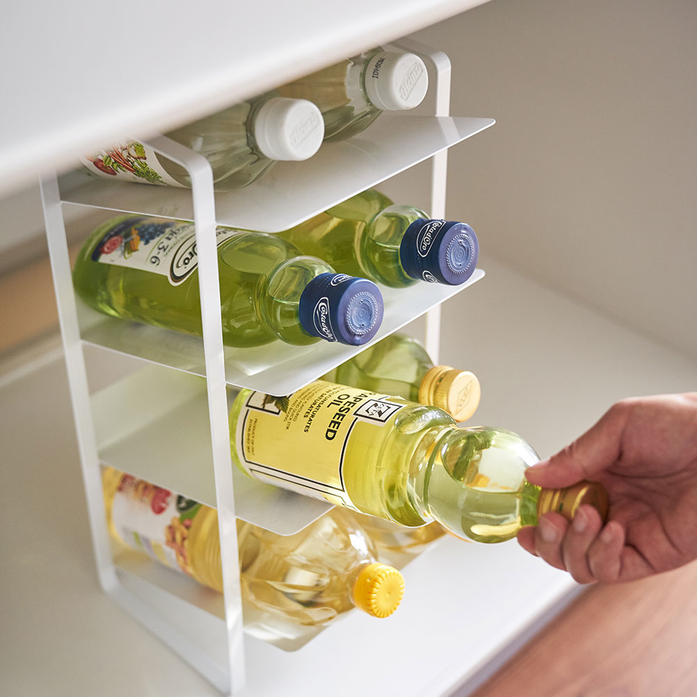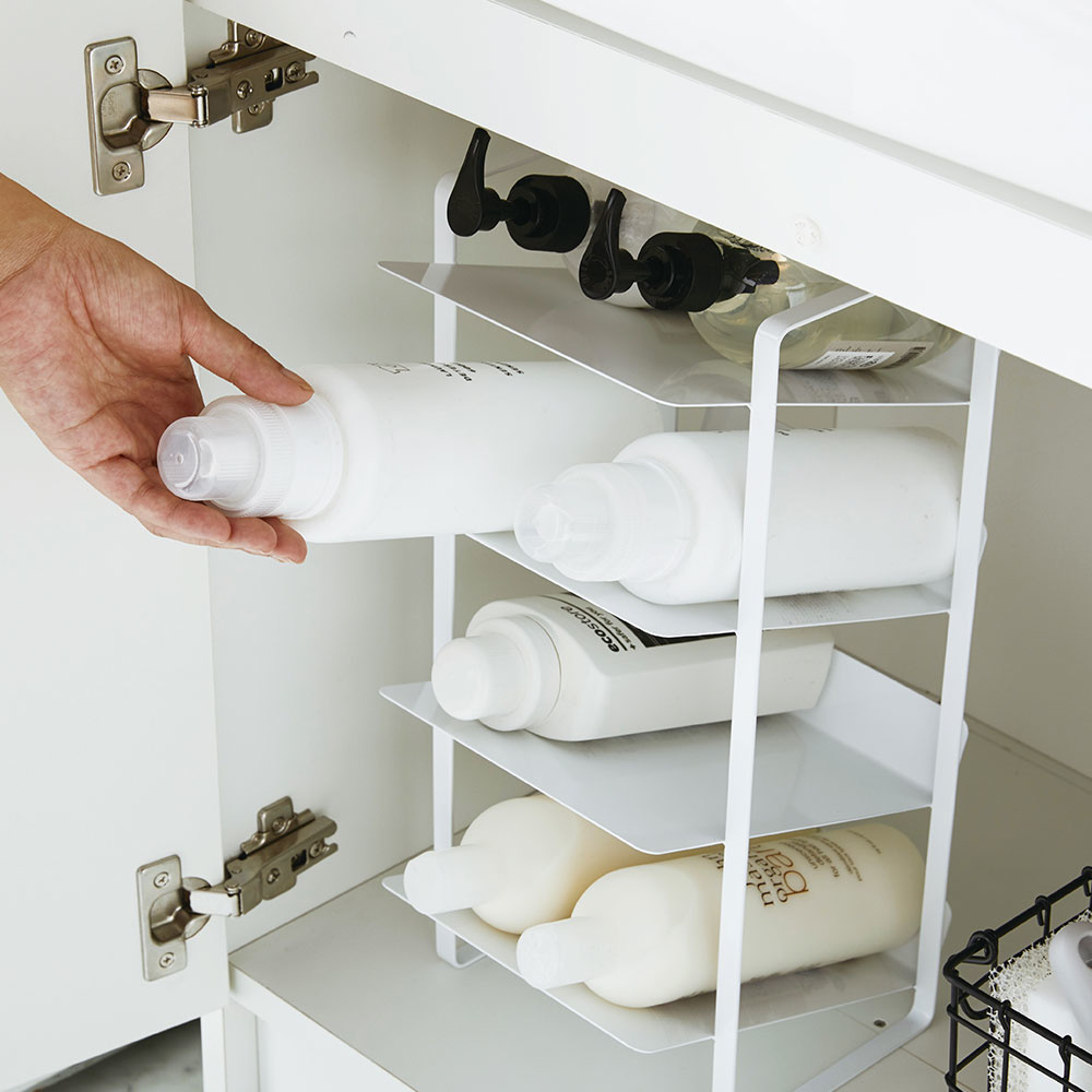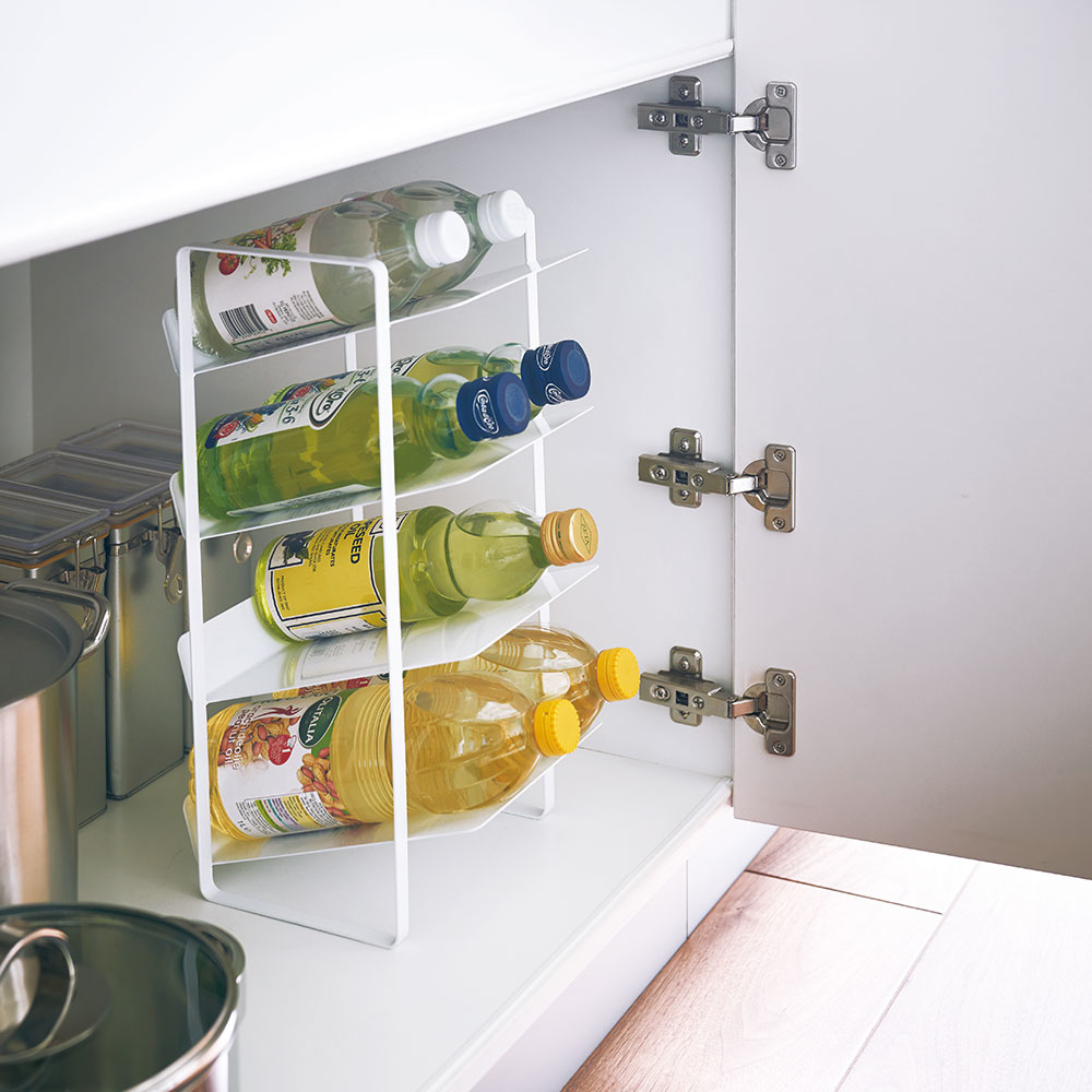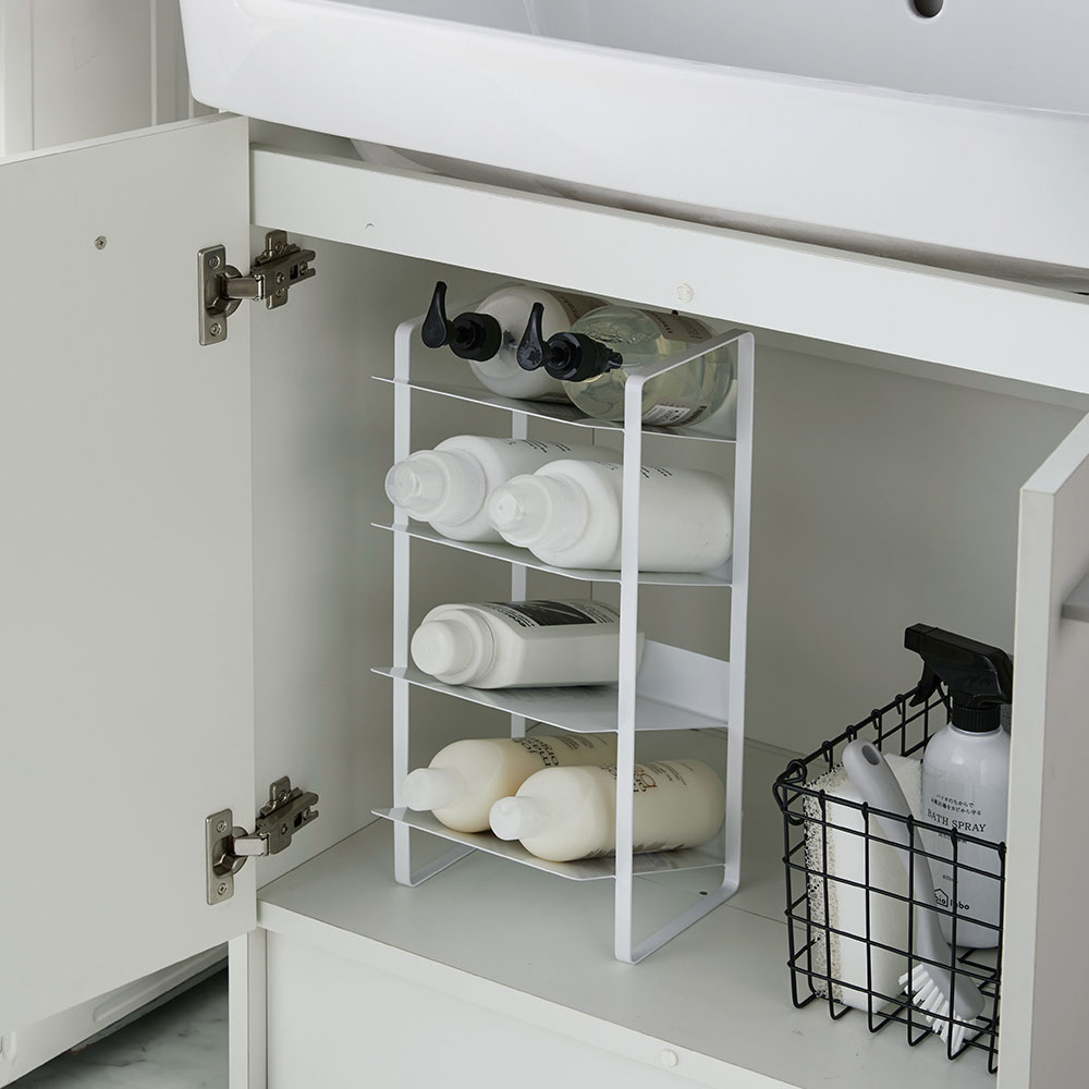 Dit keukenkast rekje met 4 niveaus is ideaal om structuur aan te brengen aan je keukenkast of gootsteenkast. Met deze keukenkast organizer kun je flesjes met (olijf)olie, azijn of dressing handig bij elkaar neerleggen of schoonmaakflessen opbergen.